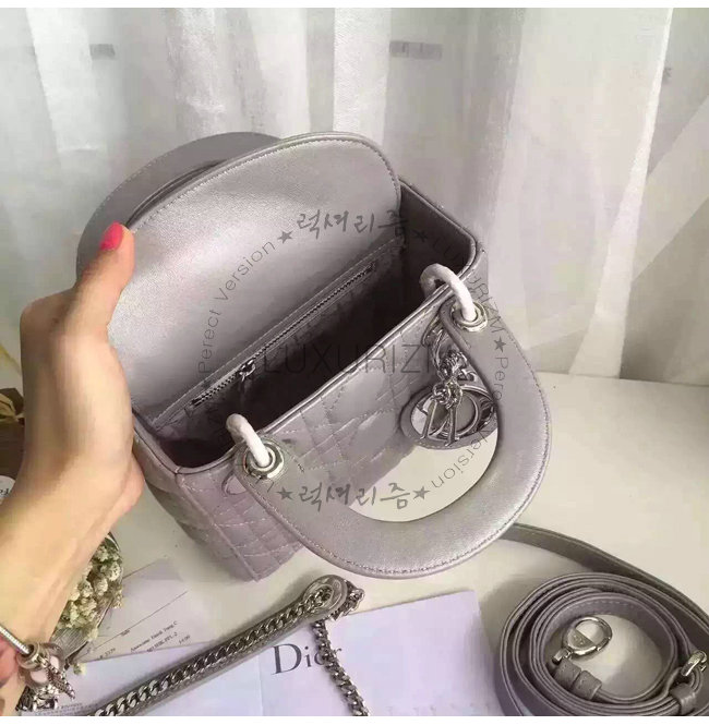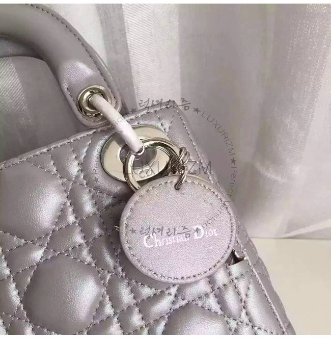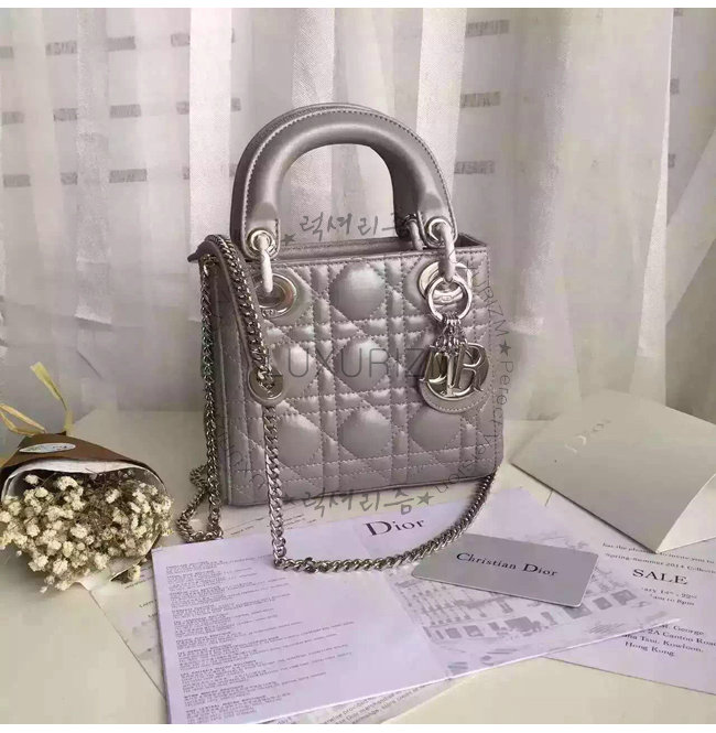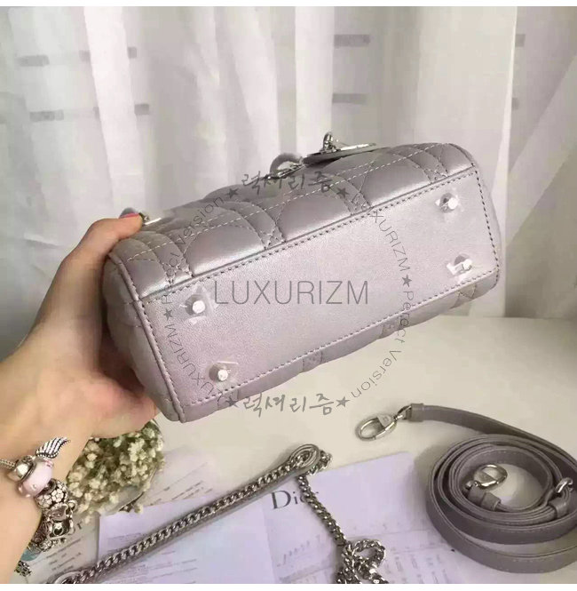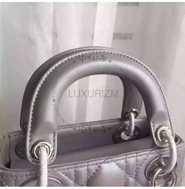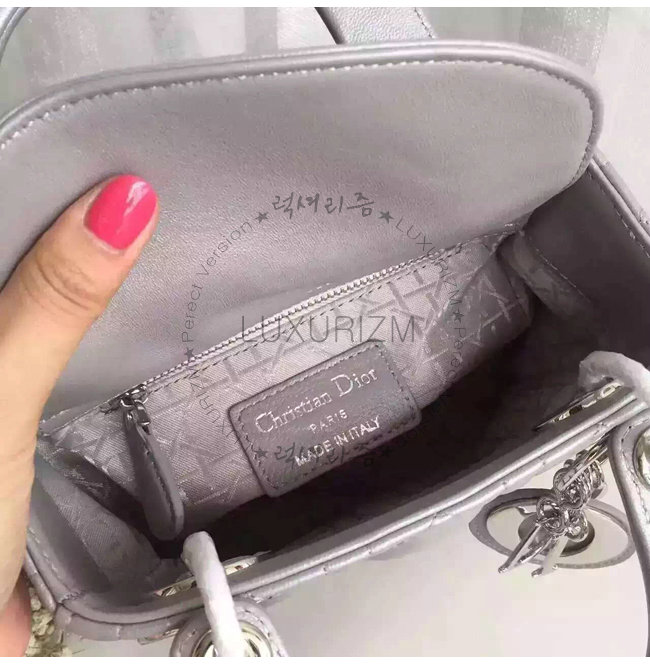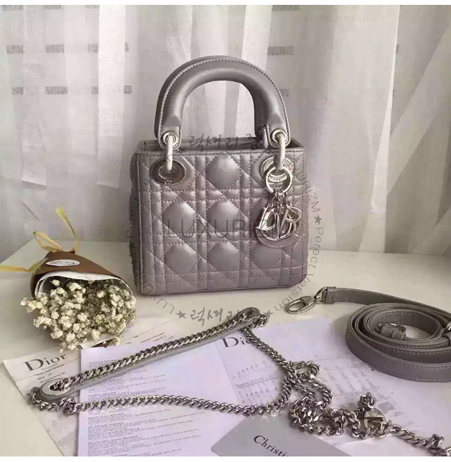 "Lady Dior" 백. 몽테뉴 그레이 양가죽 미니 백에 장식된 디올의 상징적인 "까나쥬"
