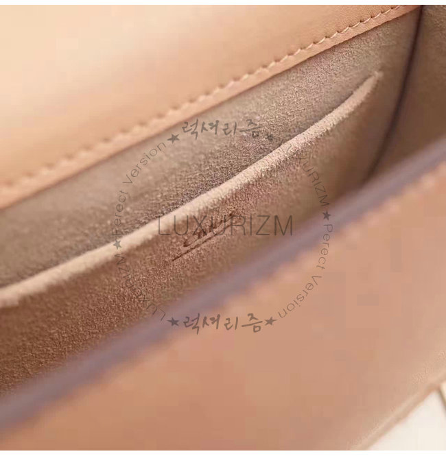 -브래스 마감/세련된 beige 스웨이드 카프스킨 안감/뒷면에 외부 플랫 포켓.