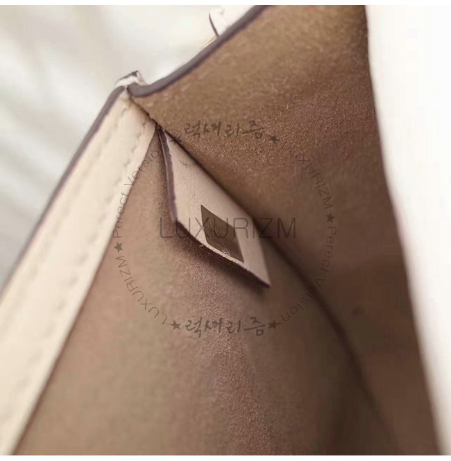 -브래스 마감/세련된 beige 스웨이드 카프스킨 안감/뒷면에 외부 플랫 포켓.