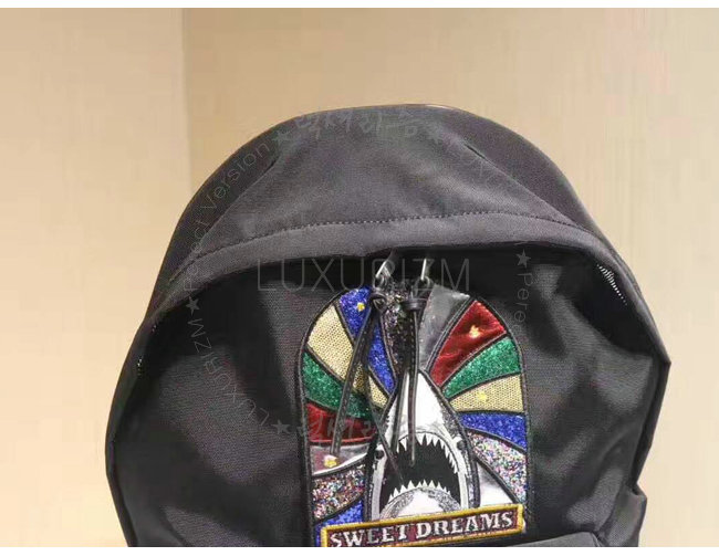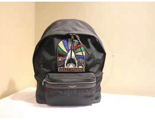 전면의 SWEET DREAMS 샤크 패치 생 로랑 시그니처가 양각으로 새겨진 외부지퍼 포켓