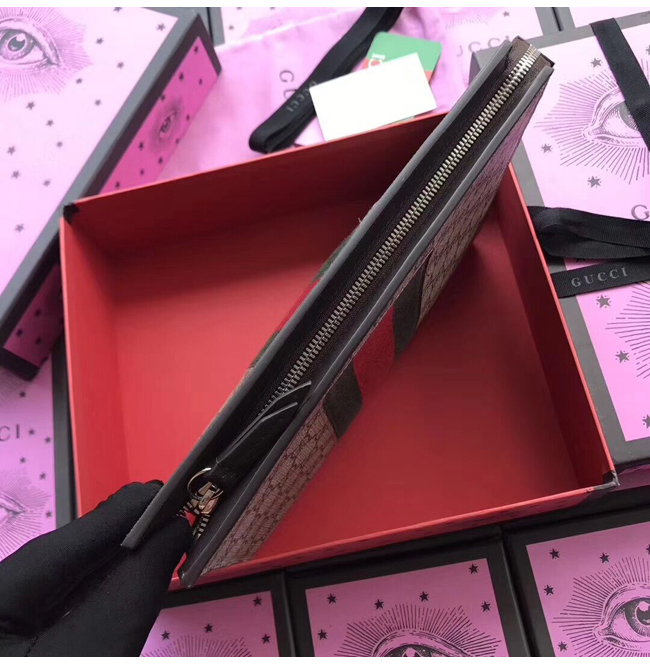 베이지/에보니 GG 수프림 캔버스 그린/레드/그린 Web 디테일 내부 오픈 포켓 지퍼 잠금장치.