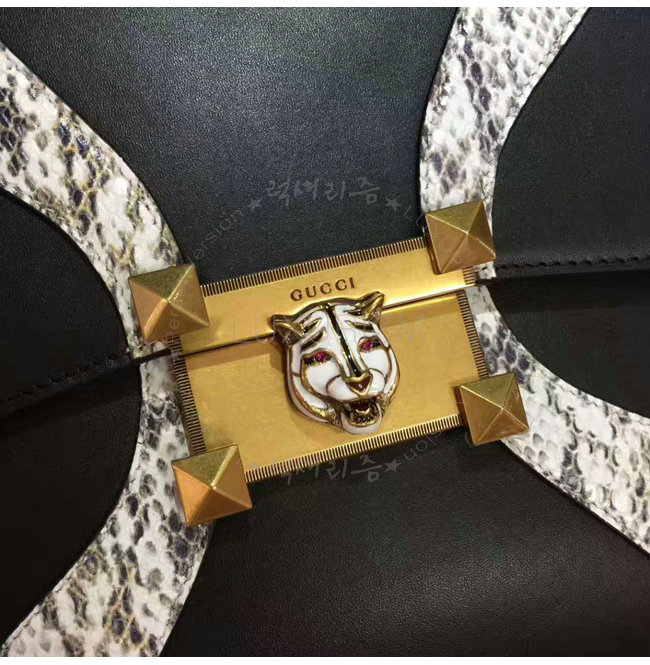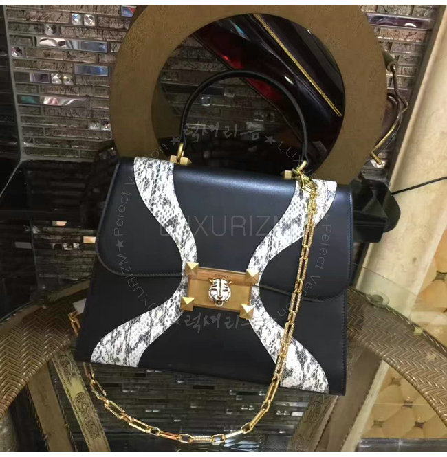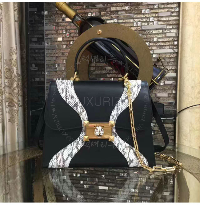 [스페셜오더]GUCCI-476435 8220 구찌 블랙 가죽 스네이크 스킨 트리밍 탑 핸들 백
