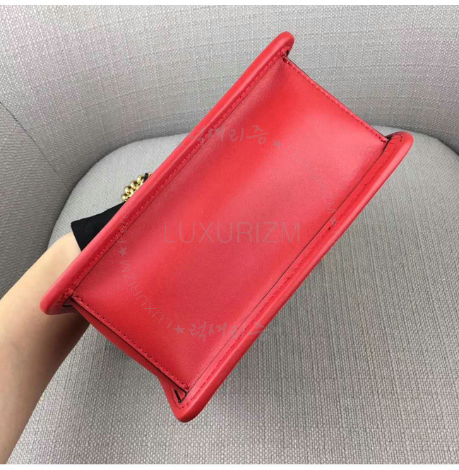 핸드백 겸용.레드 컬러의 가죽소재.팔라듐 골드 피니싱이 믹스된 메탈장식.