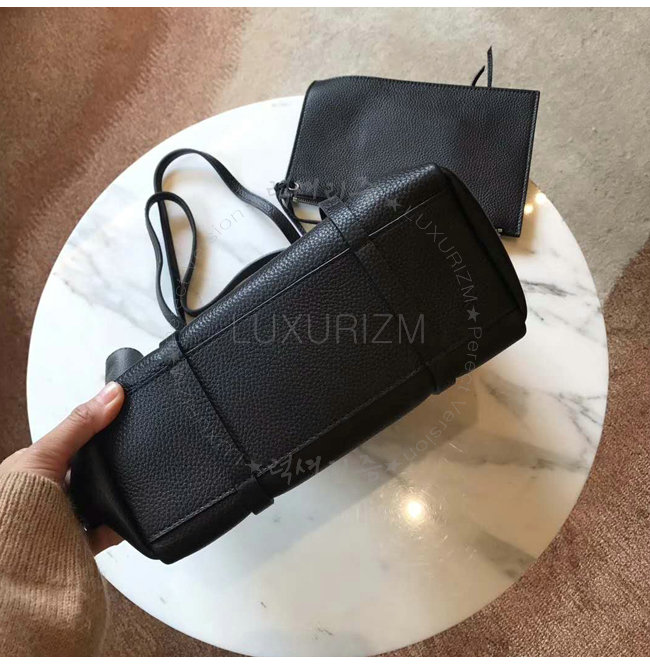미디엄 사이즈 쇼핑백 슬림형 핸들 샤이니한 팔라듐 마감 내부 지퍼 가죽 파우치 탈부착 가능한