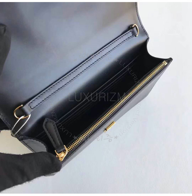 장식. 탈부착 가능한 체인 숄더 스트랩. 블랙 컬러의 송아지 가죽 소재. 골드 메탈 장식.