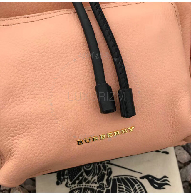 드로스트링 여밈 수작업으로 마감칠된 테두리 유광금속 하드웨어 앞면의 버버리 양각로고.