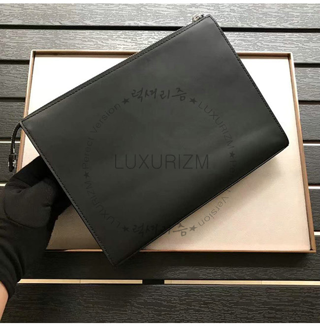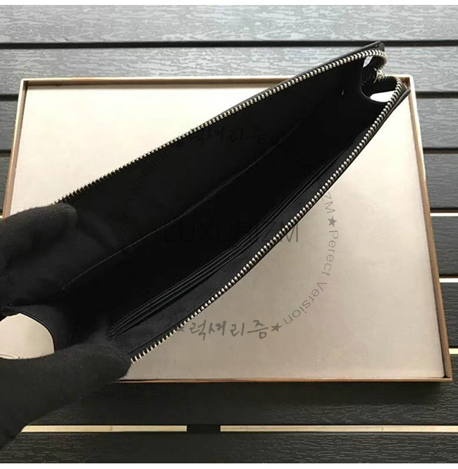 지퍼 잠금장치의 포셰트. 내부 플랫 포켓. 블랙 송아지 가죽 소재.