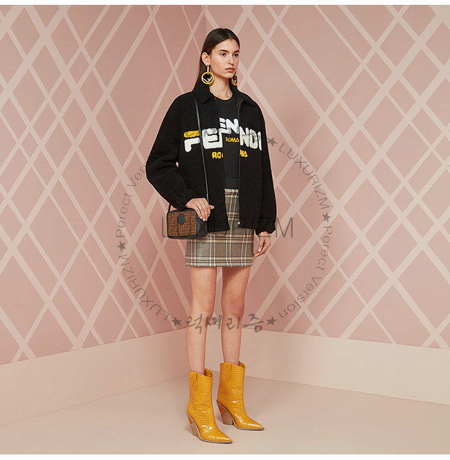 모티프 장식. 펜디 스탬프 패치와 블랙 컬러의 가죽 디테일. 골드 피니싱 메탈웨어.
