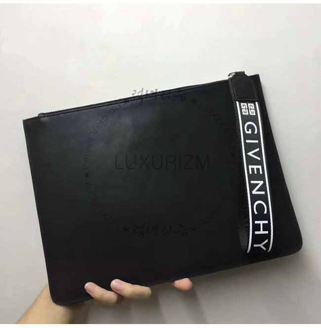 메탈 지퍼와 흑백 GIVENCHY 4G 자카드 손목 띠가 달린 커다란 검정 코팅 캔버스 파우치.