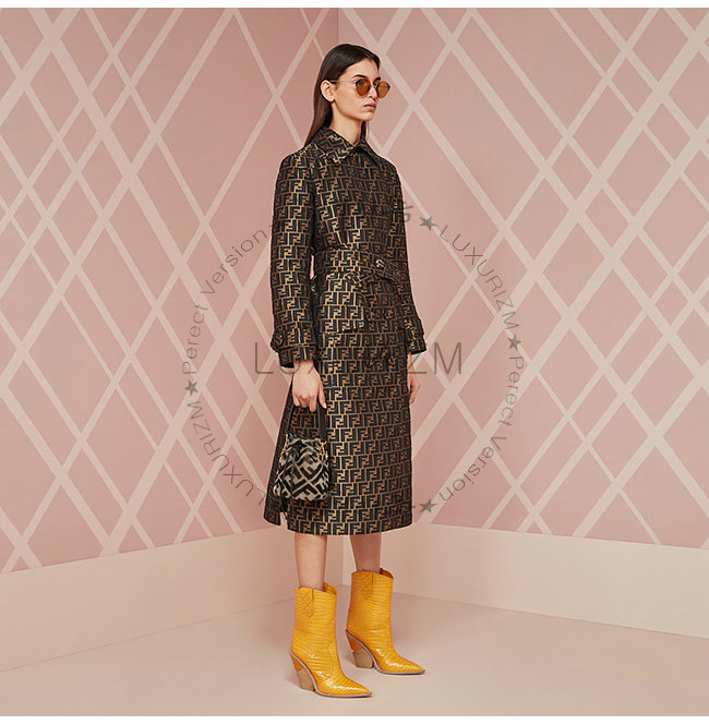매크로 FF 프린트. 블랙 컬러의 가죽 디테일. 골드 피니싱 메탈웨어.