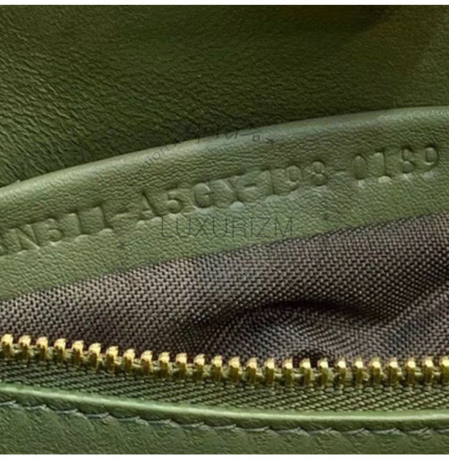 그린 컬러의 송아지 가죽 소재. 골드 피니싱 메탈웨어.
