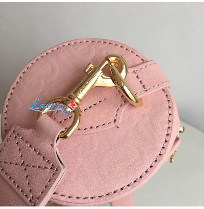 모노그램이 연출된 가죽 소재의 원통형 마이크로 배럴 백.
