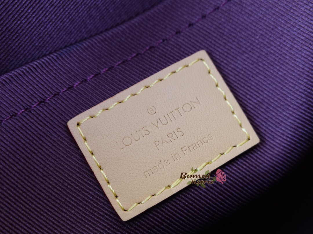 가죽 모서리와 옆면 밴드, LV 키 벨이 특징.