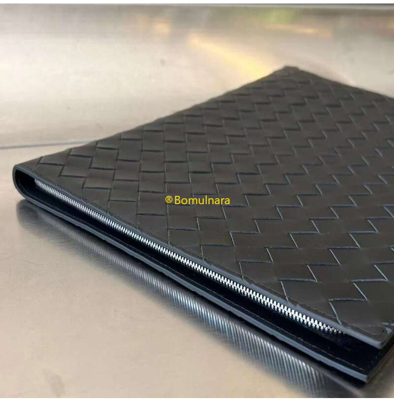 가죽 소재를 인트레치아토 위빙으로 완성한 파우치.