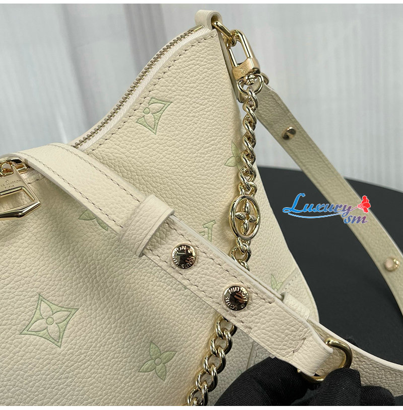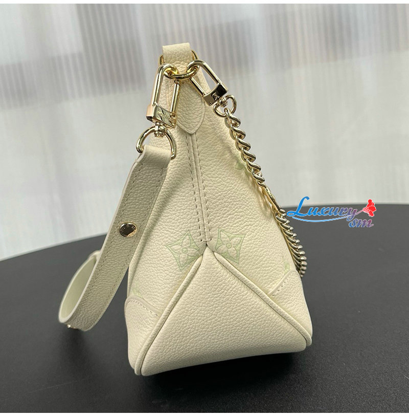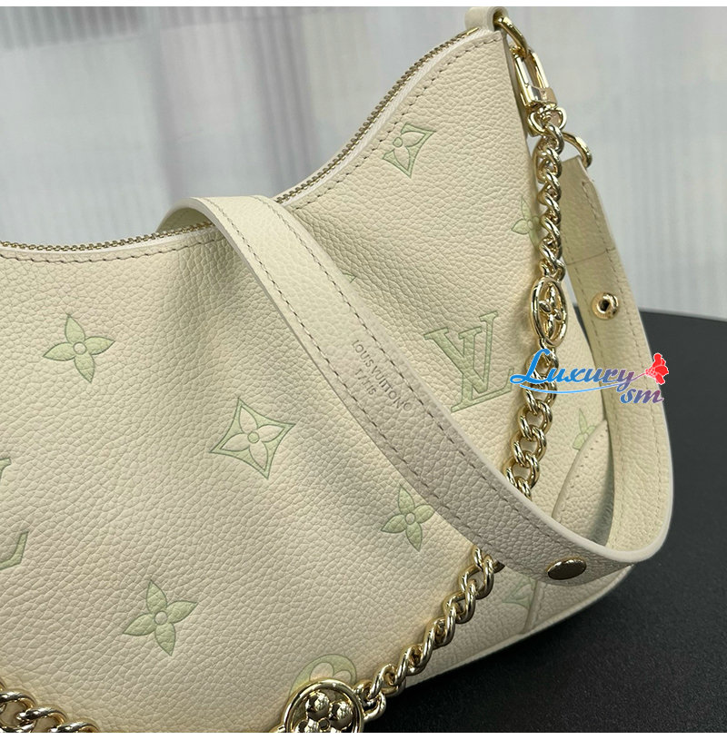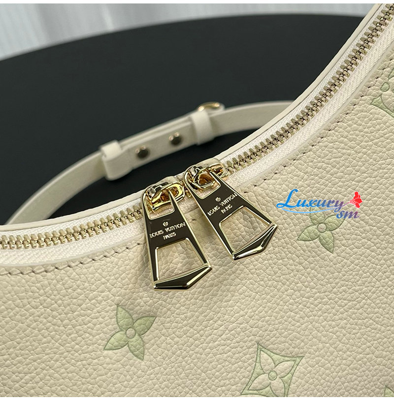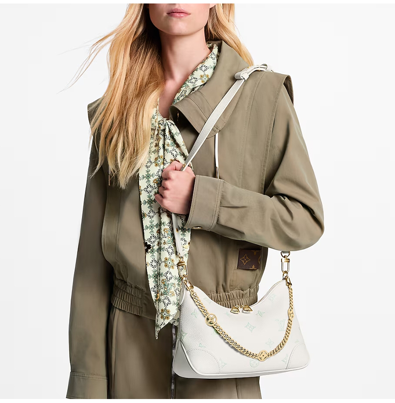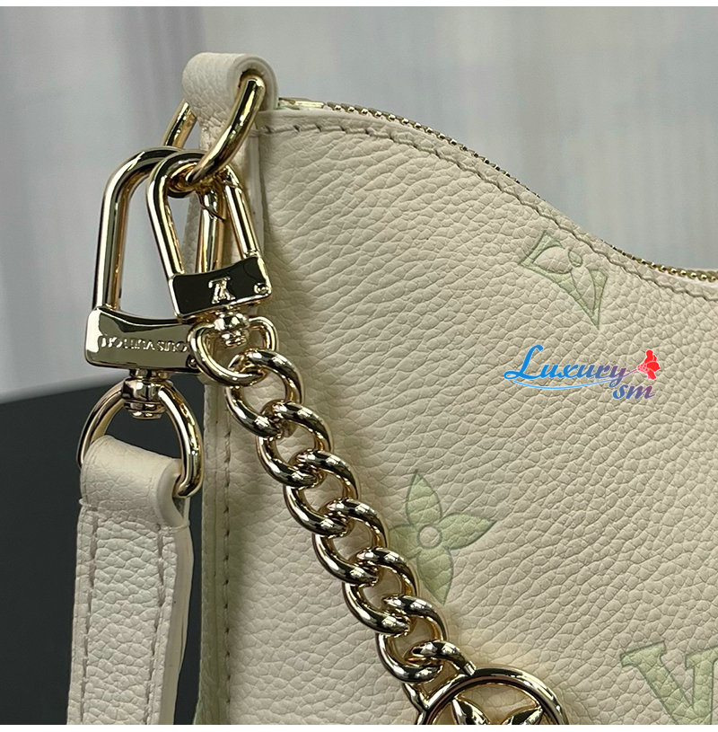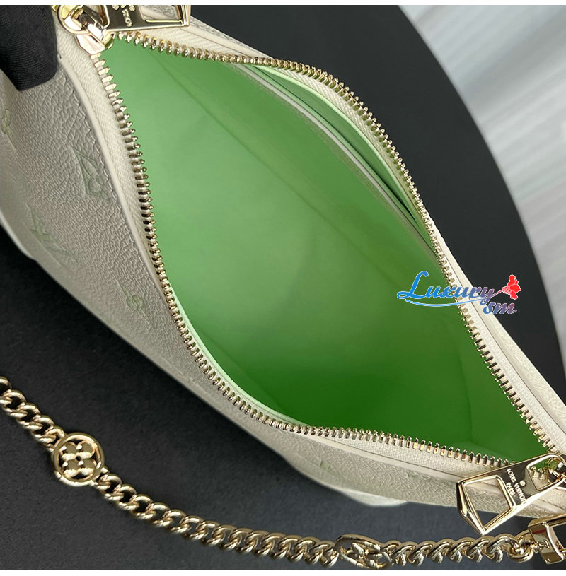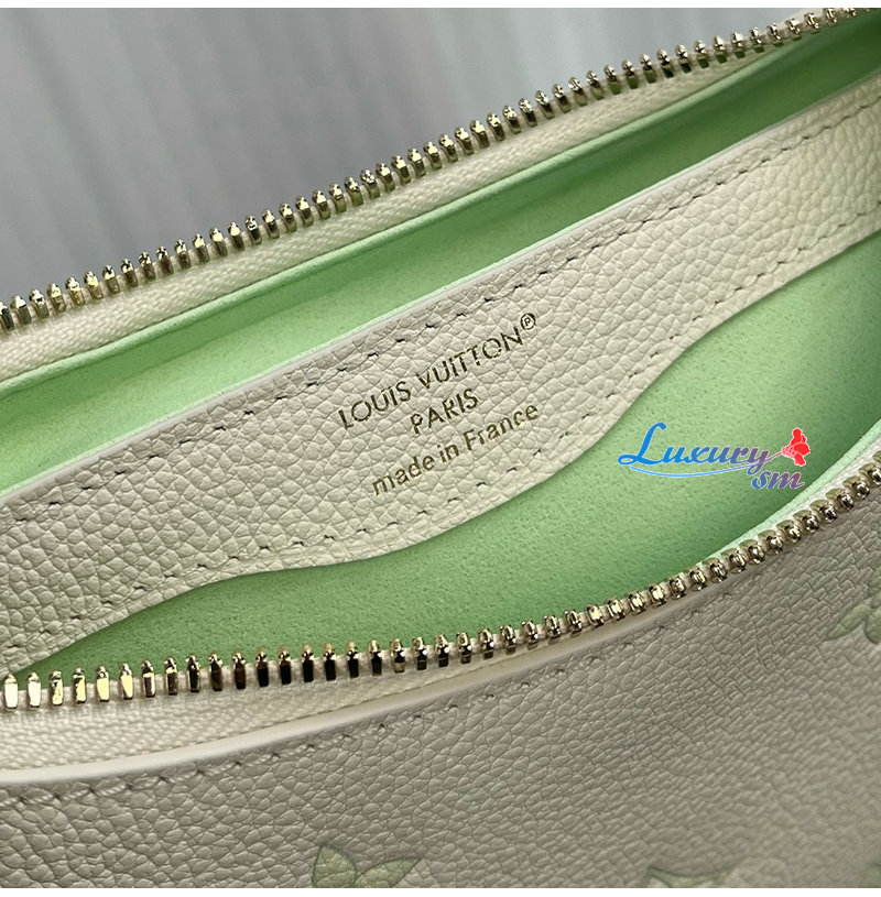 밀키 화이트 및 그린 색상의 가죽 소재. LV 플라워