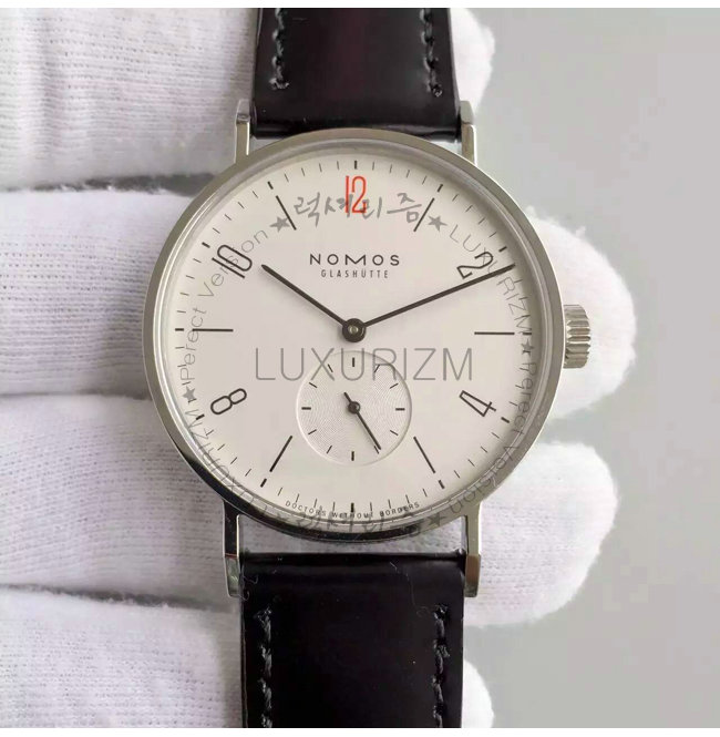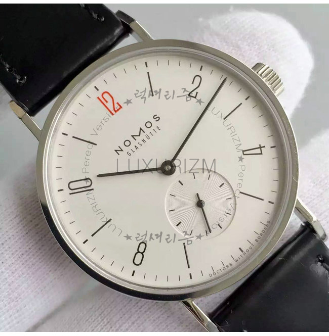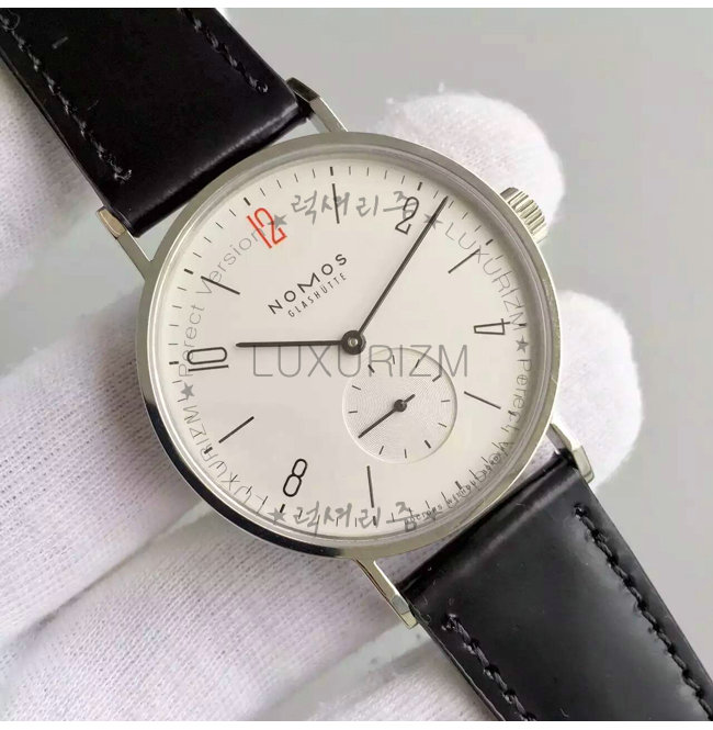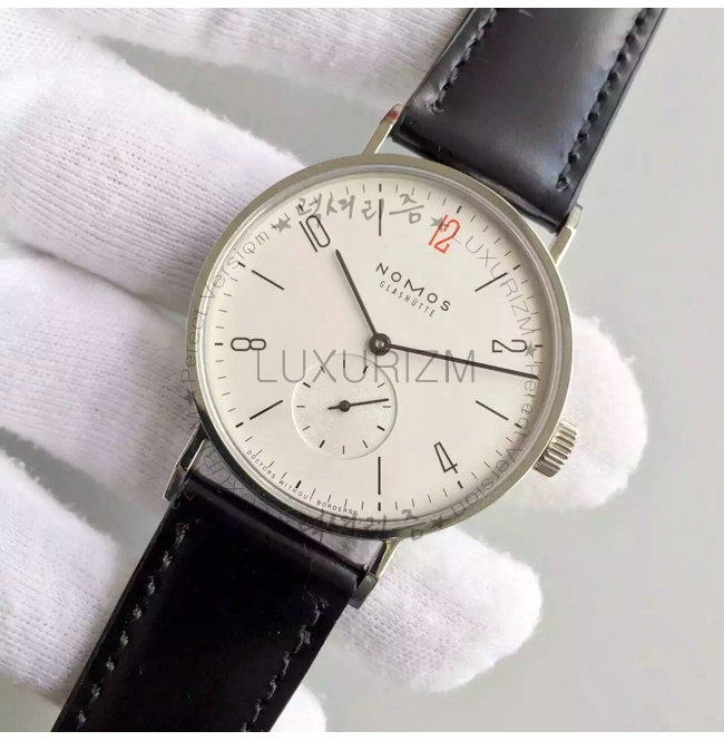 -화이트 플레이트 다이얼/블랙 핸즈 12시 방향 숫자 레드 핸즈/블랙 레더 벨트식 스트랩/용두 노모스 각인.