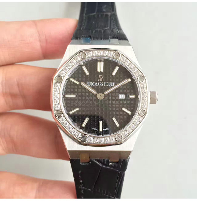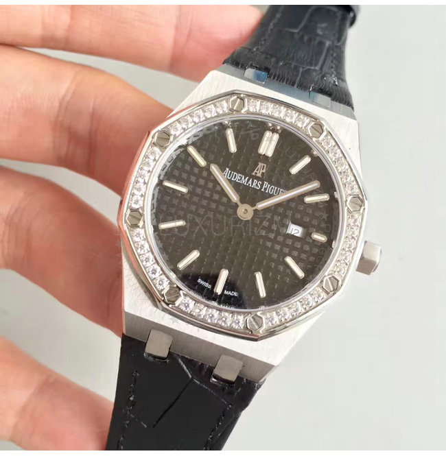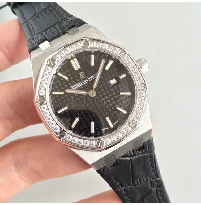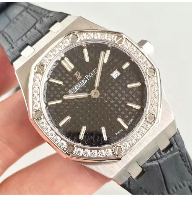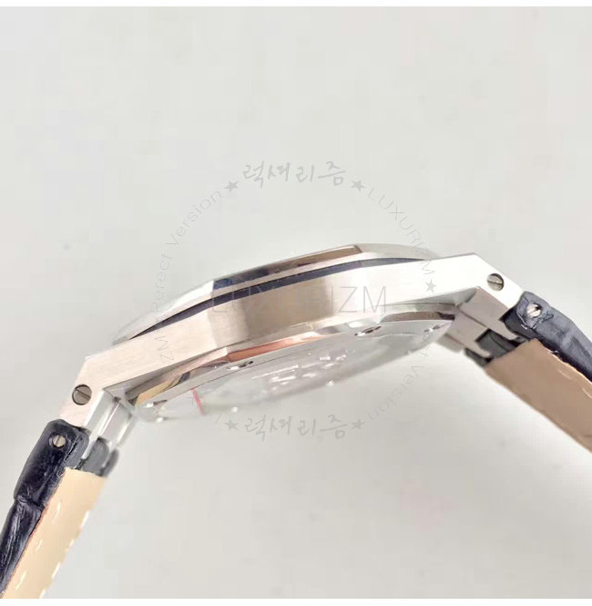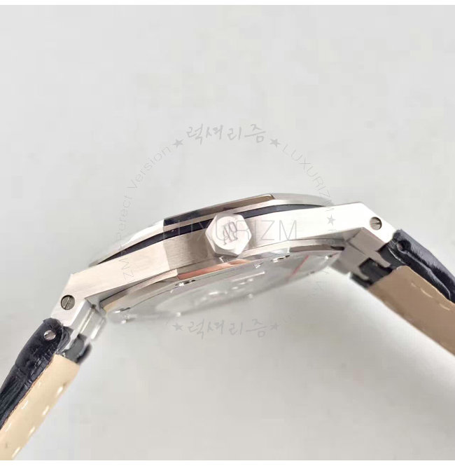 -스테인레스스틸 크라운/다이아몬드 셋팅 베젤/로얄 오크 핸즈/가죽 스트랩 폴딩 클랩.
