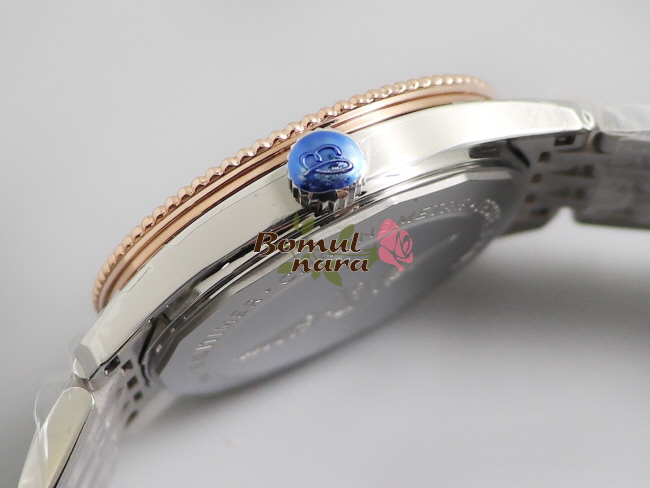스틸소재로 출시된 38mm 케이스는 구슬 장식 베젤과 우아한