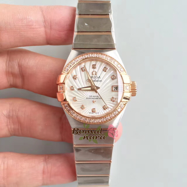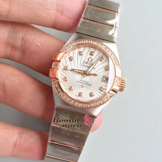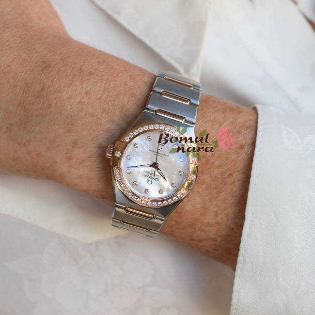 [스페셜오더]OMEGA-오메가 컨스텔레이션 레드 골드 다이아 베젤 인덱스 스틸 화이트 레이디스워치 27mm