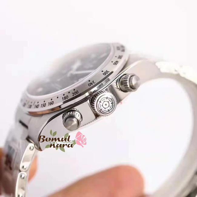 ▶고정 스틸 베젤 , 블랙 래커 처리된 타키미터 눈금 각인