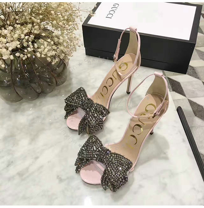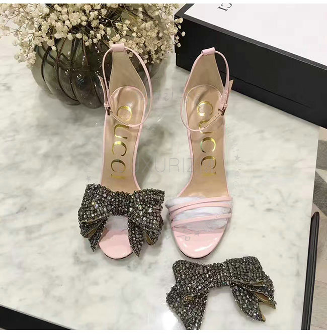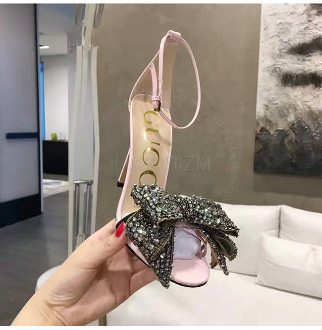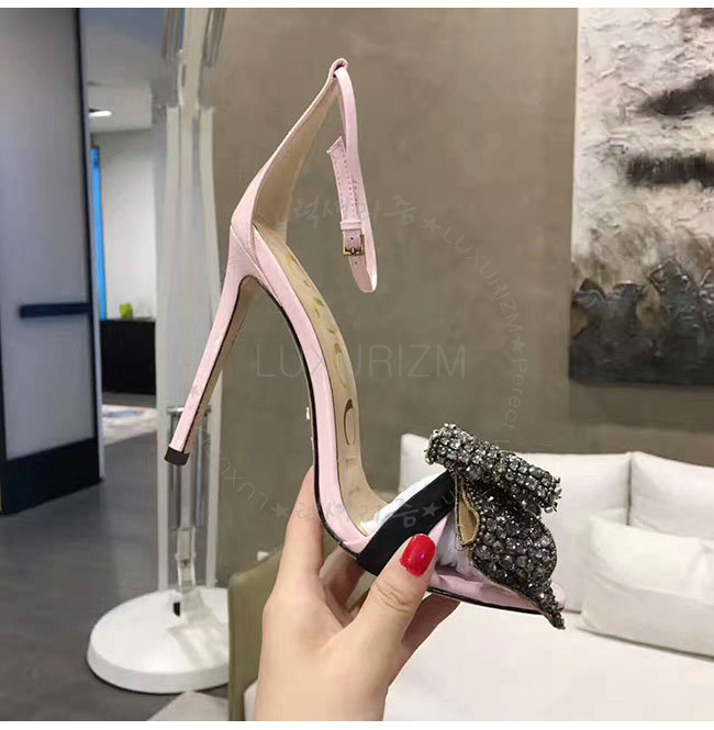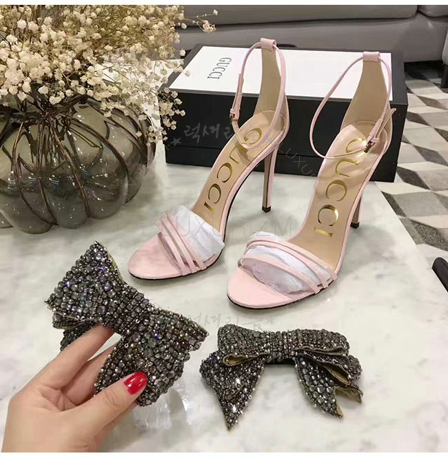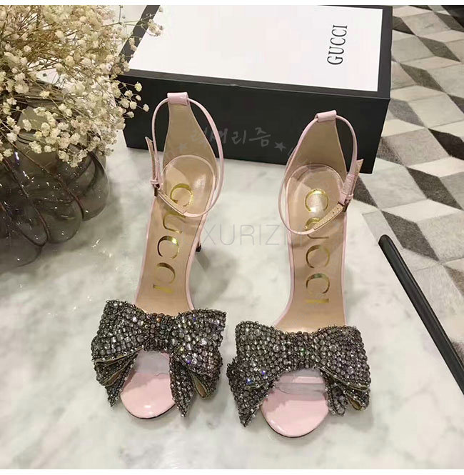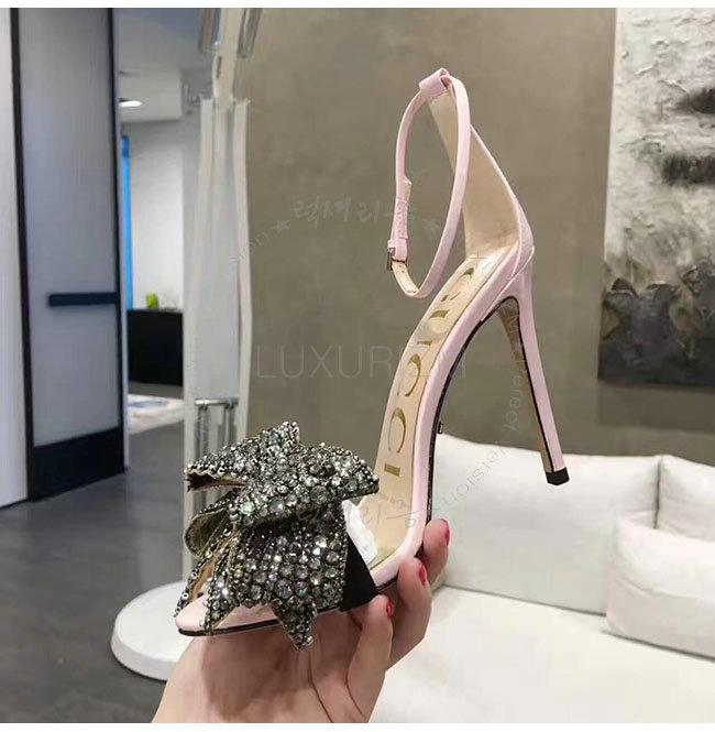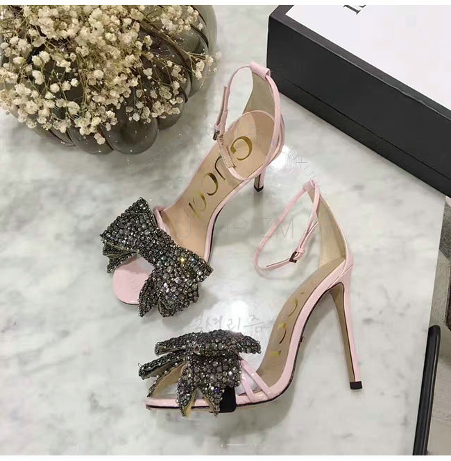 GUCCI-465995 5823 구찌 탈착 가능한 크리스탈 새틴 패턴 핑크 가죽 샌들 여성용