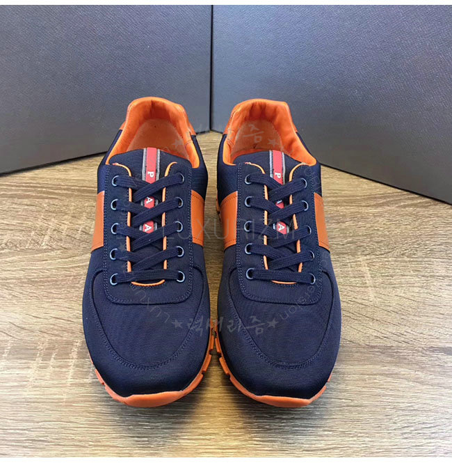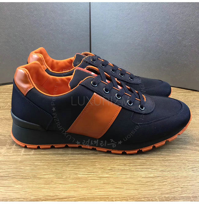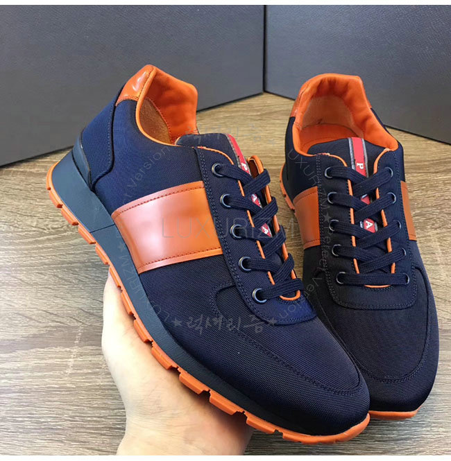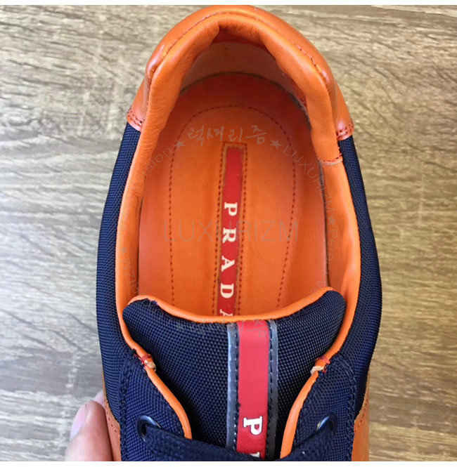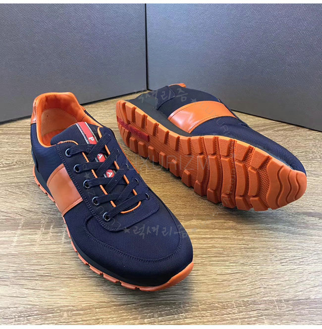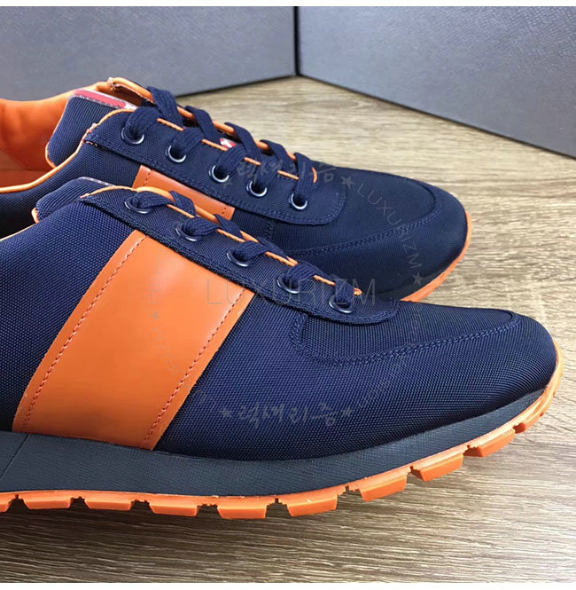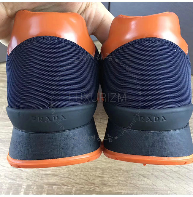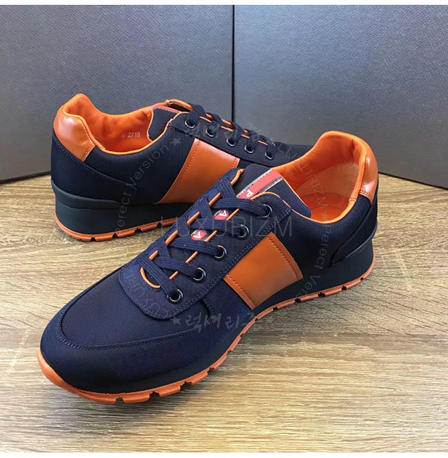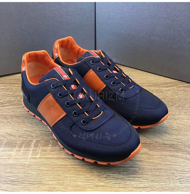 PRADA-4E2718 프라다 오렌지 카프스킨 네이비 패브릭 스니커즈 남성용