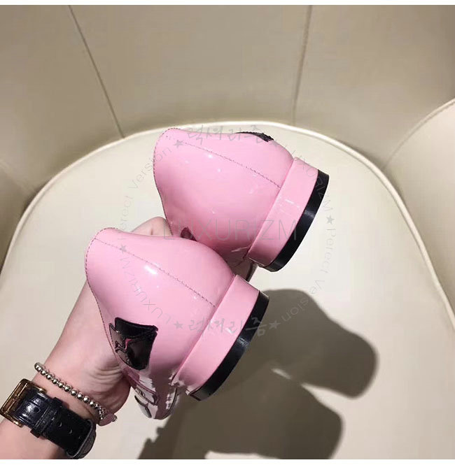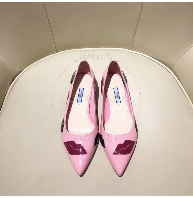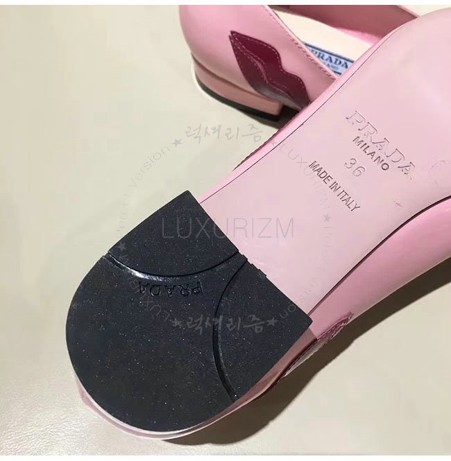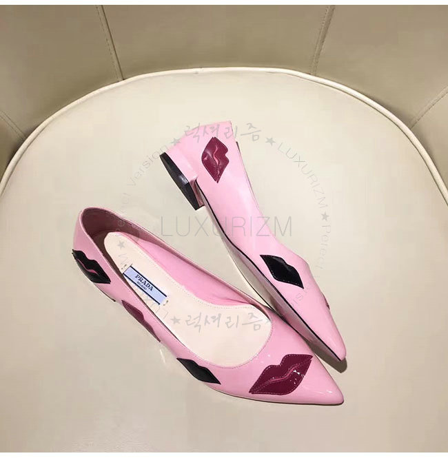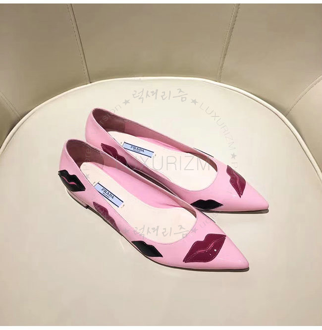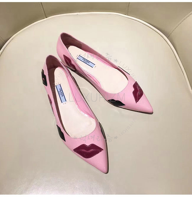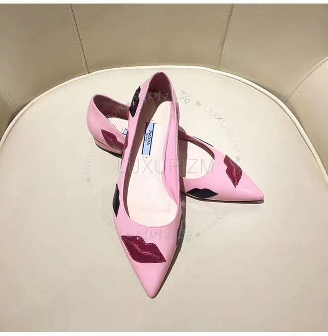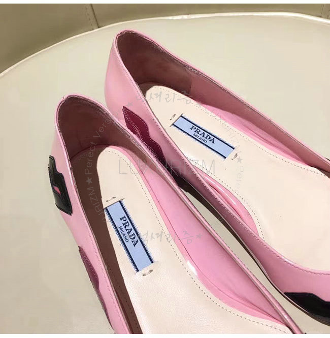 PRADA-2P254M 프라다 핑크 페이턴트 가죽 입술 아플리케 플랫 여성용