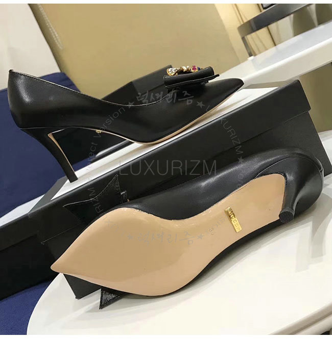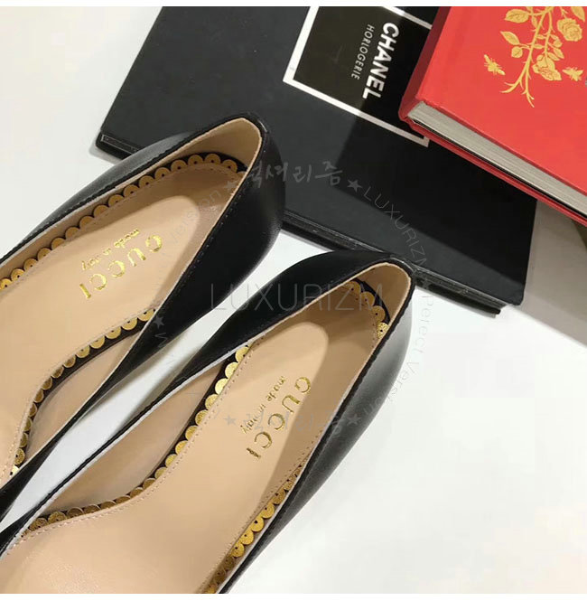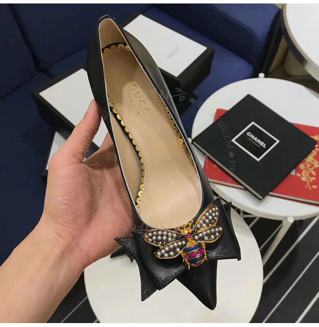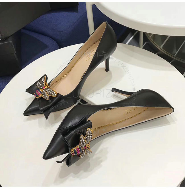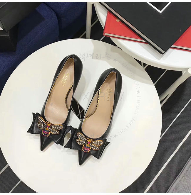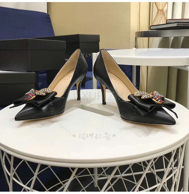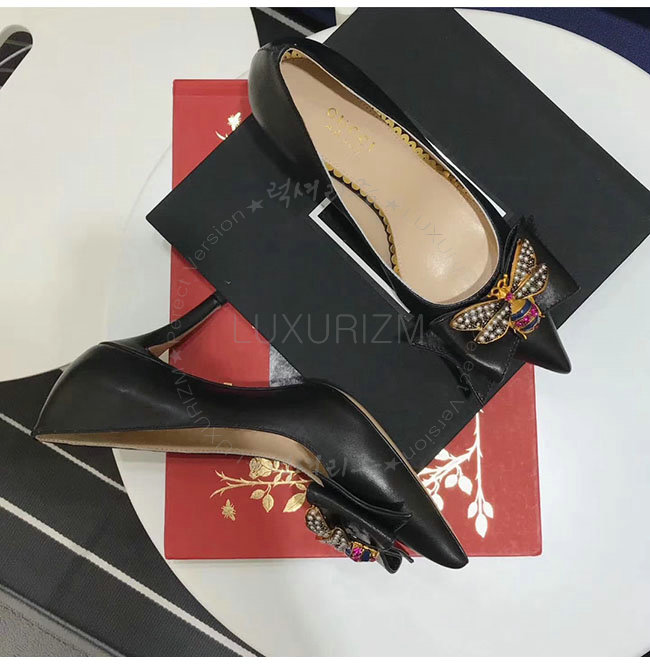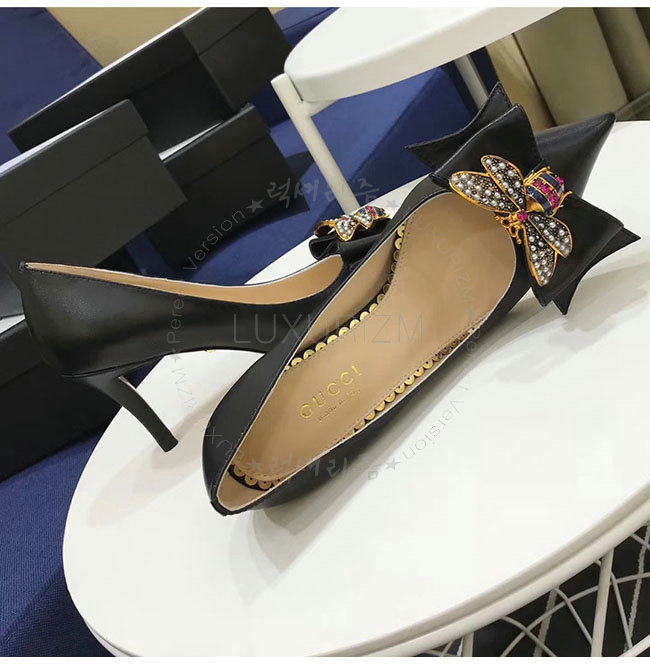 GUCCI-496641 1000 구찌 블랙 보우 디테일의 가죽 미드힐 펌프스 여성용