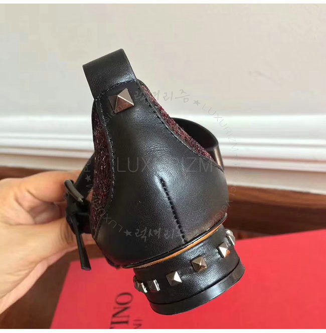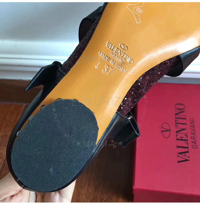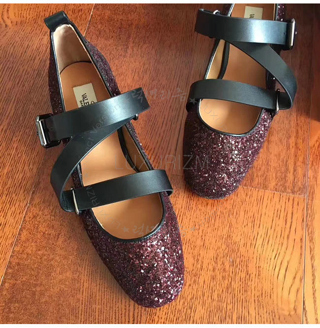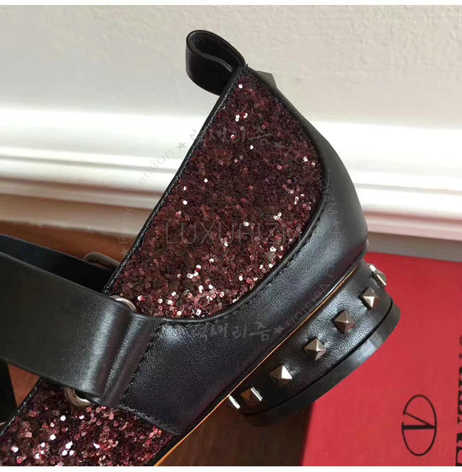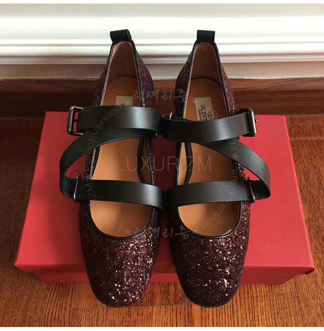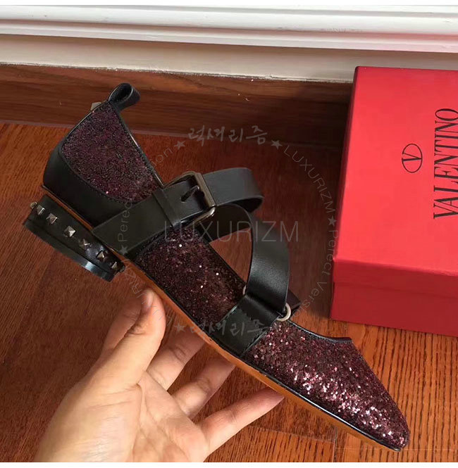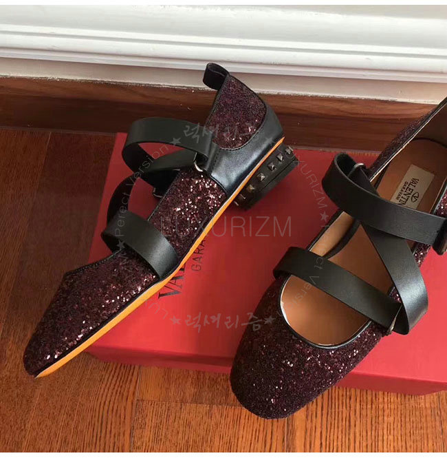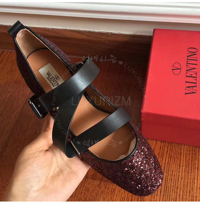 VALENTINO-NW1S0C 발렌티노 버건디 글리터 패브릭 스트랩 앤 스터드 발레리나 플랫 슈즈 여성용