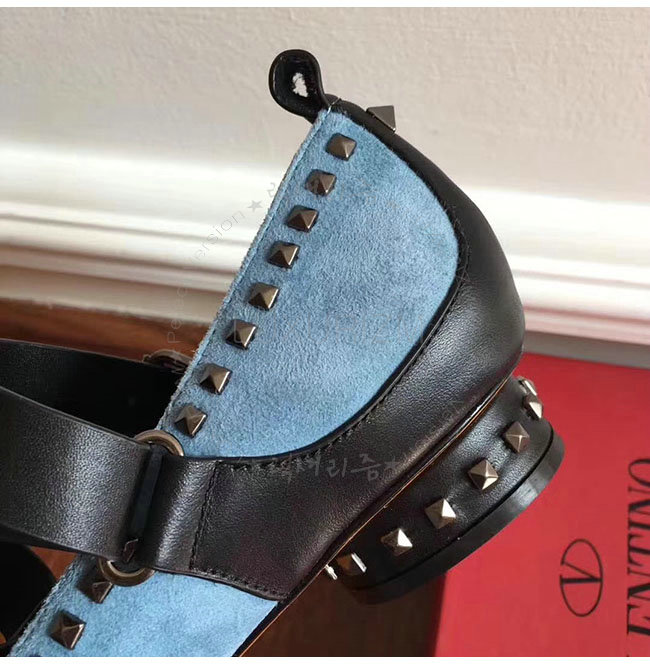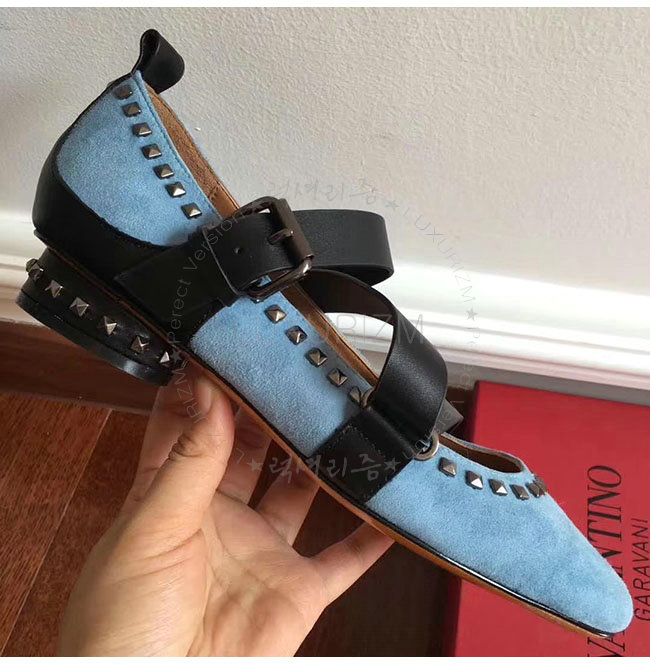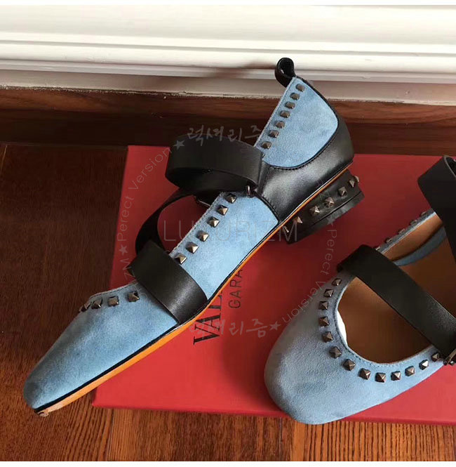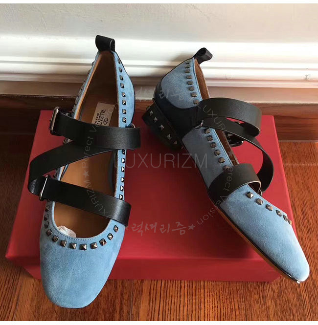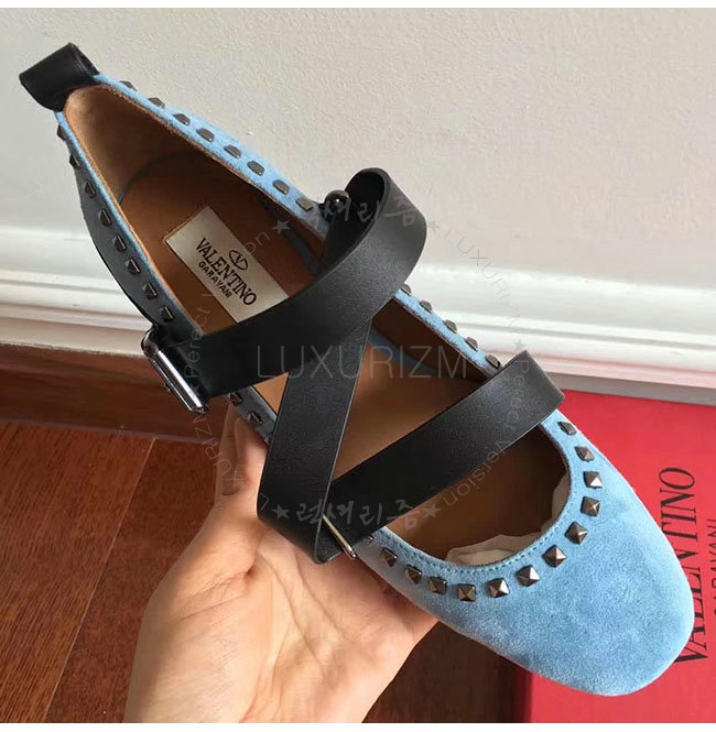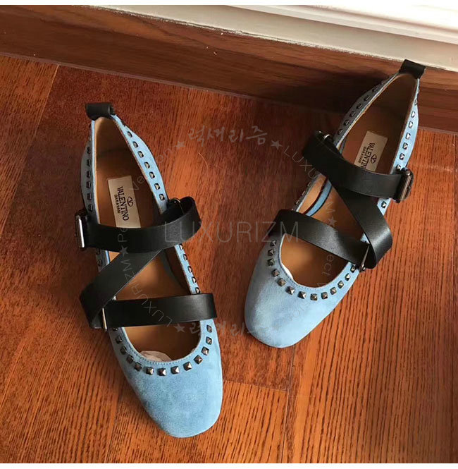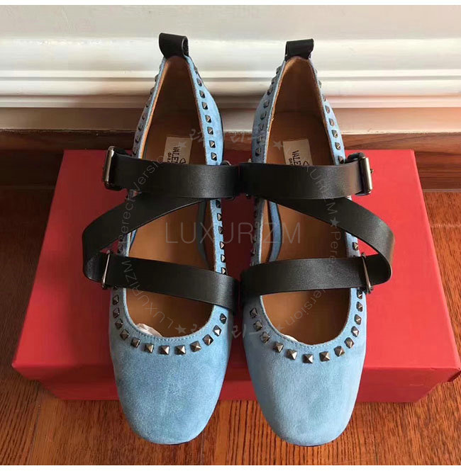 VALENTINO-NW1S0C 발렌티노 스카이 블루 스웨이드 가죽 스트랩 앤 스터드 발레리나 플랫 슈즈 여성용