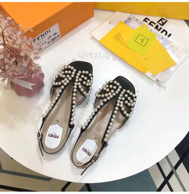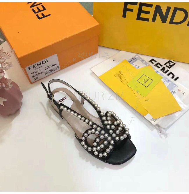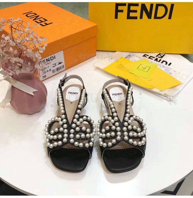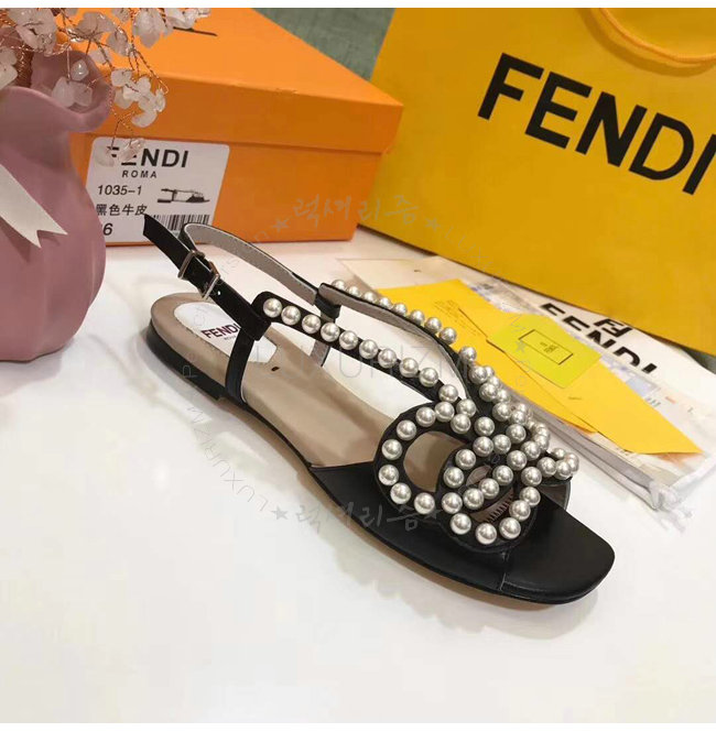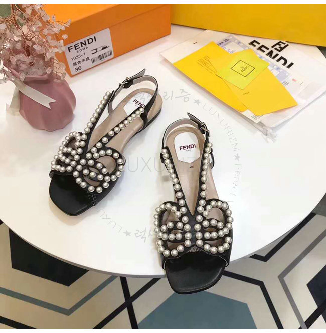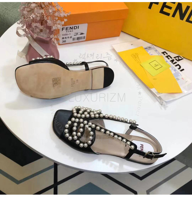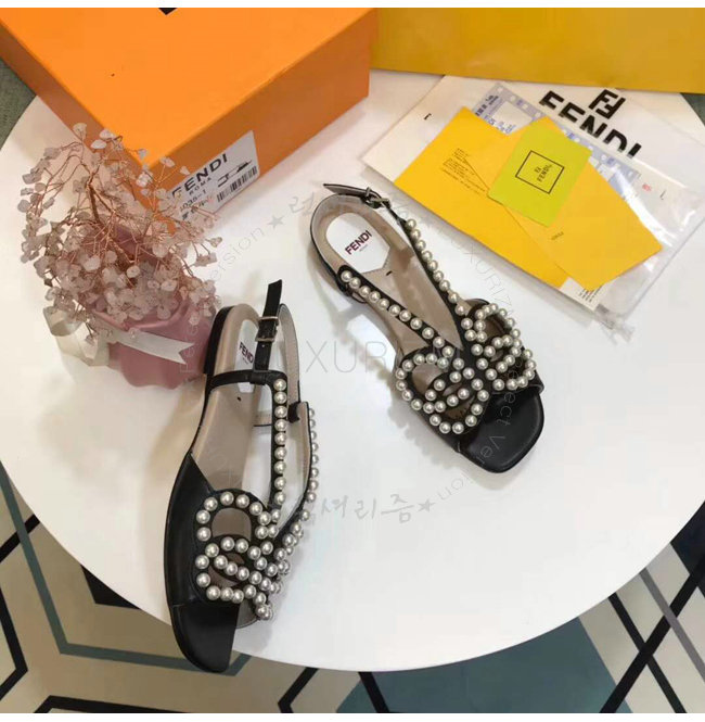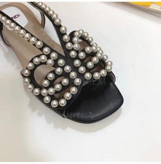 FENDI-8X6697 펜디 송아지 가죽 진주 장식 블랙 플랫 샌들