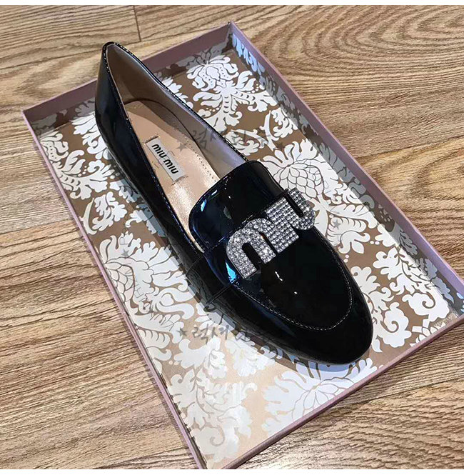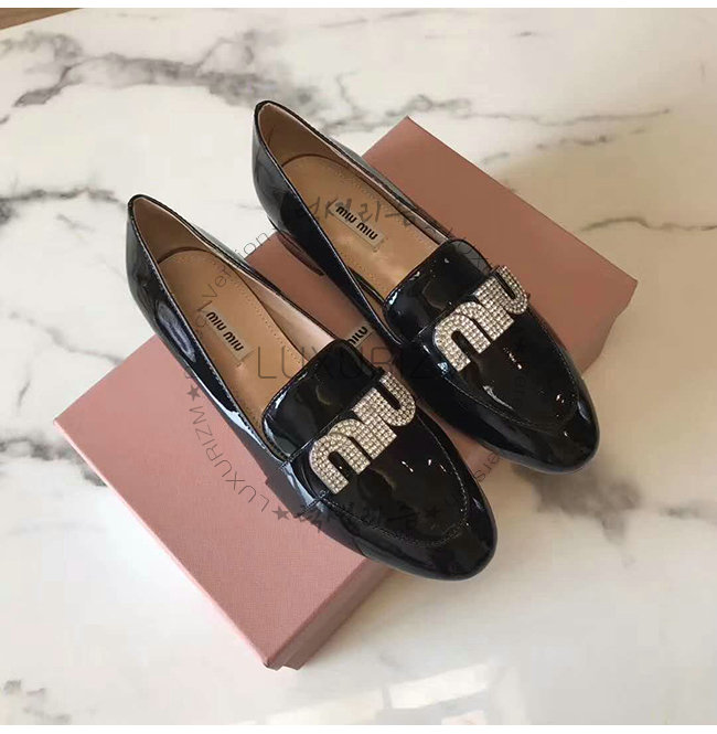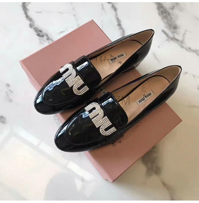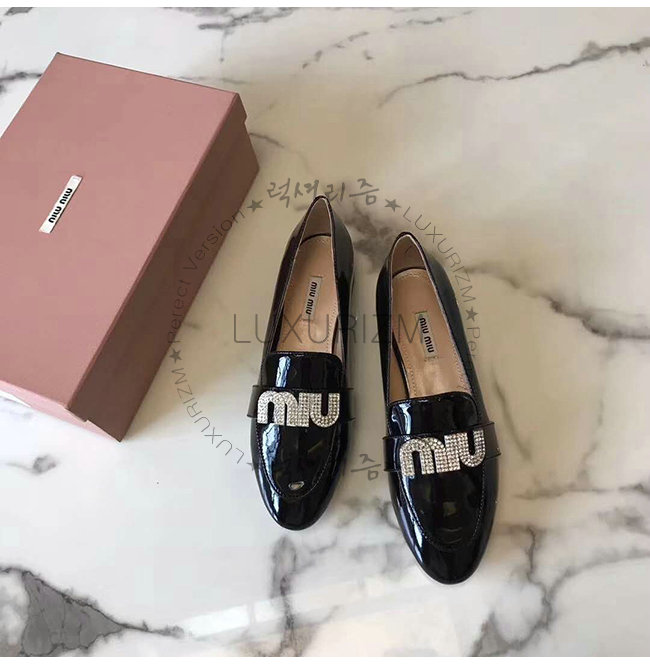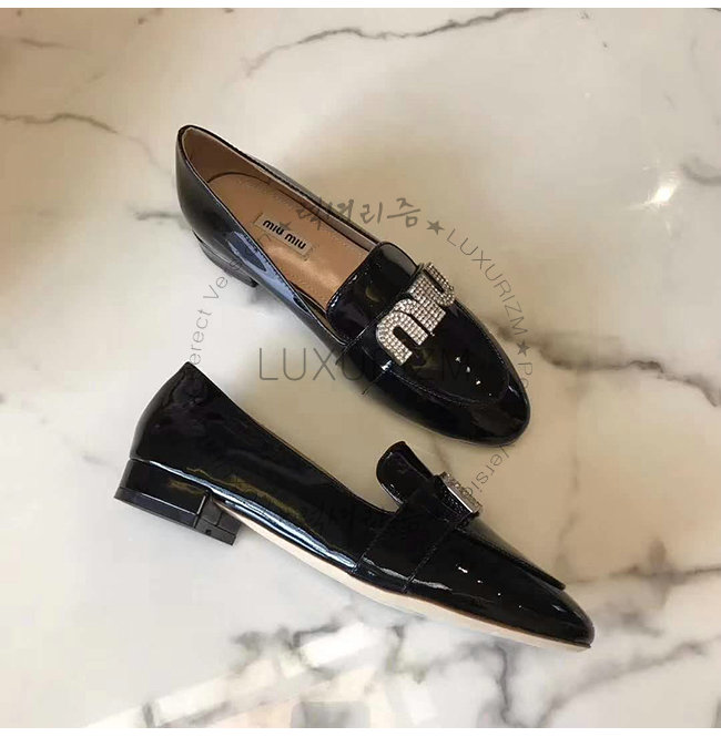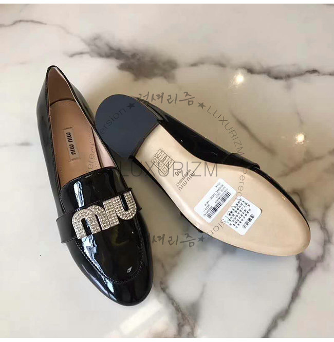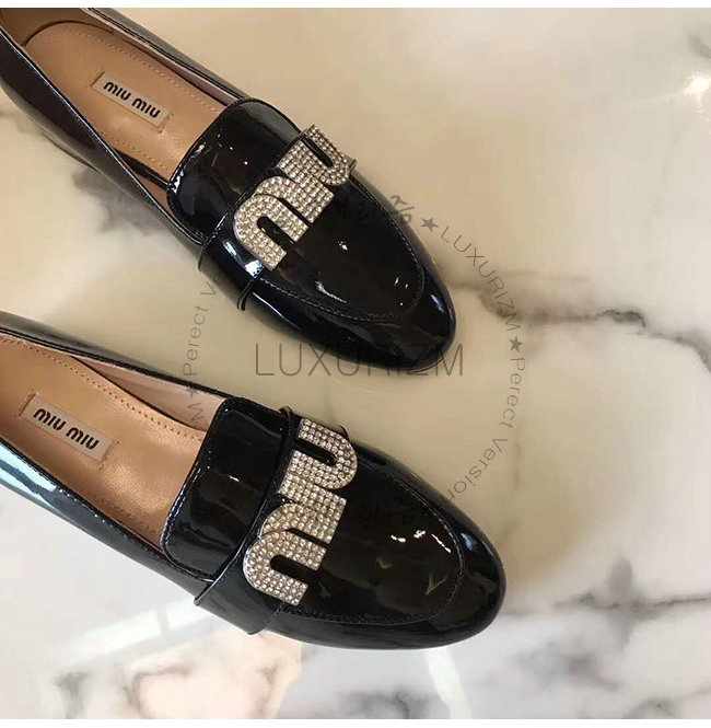 MIUMIU-5D085C 미우미우 페이턴트 카프스킨 크리스탈 장식 블랙 모카신