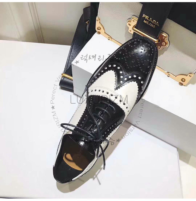 대조적인 펀칭 디테일의 유희가 돋보이는 블랙과 오프 화이트 무광 송아지 가죽 리슐리외, 힐 1.5cm.