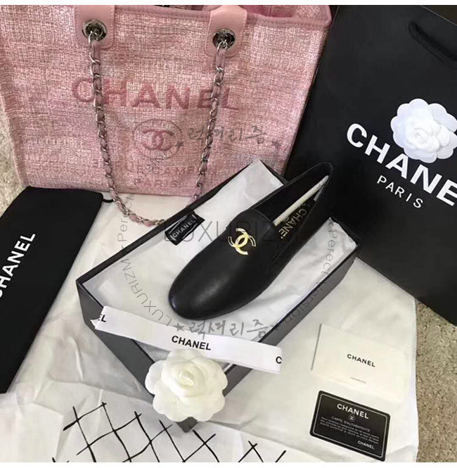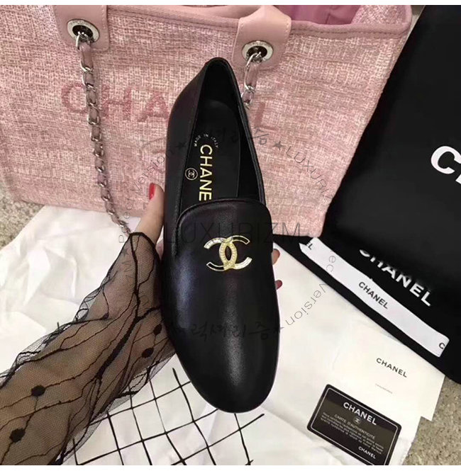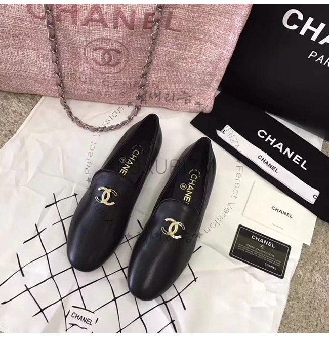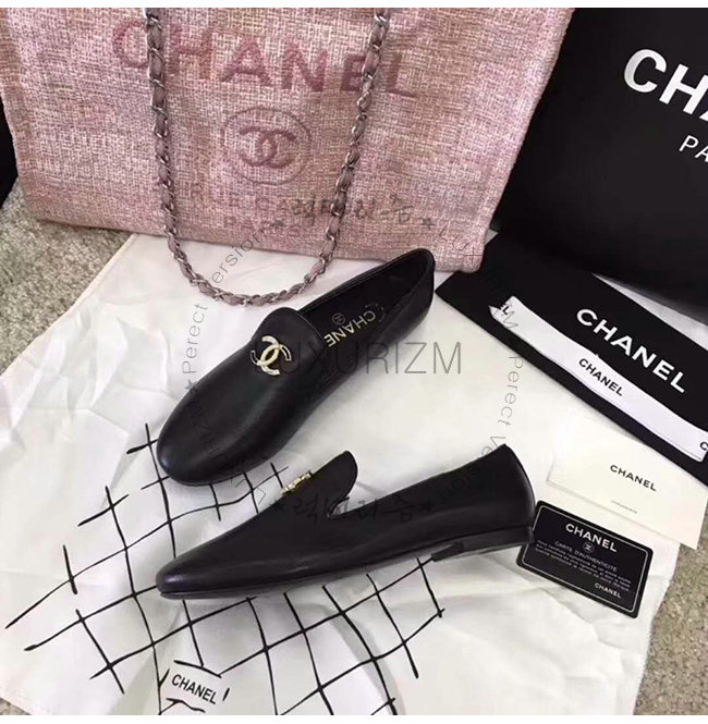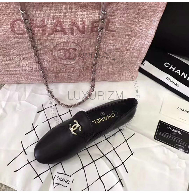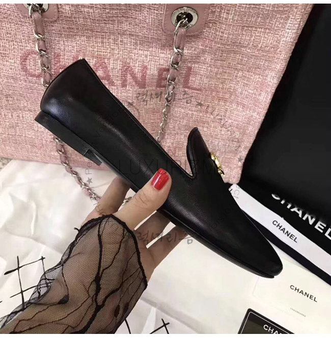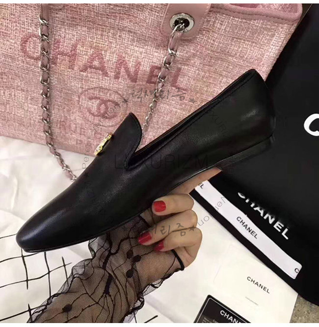 CHANEL-G32948 샤넬 블랙 램스킨 메탈 로고 장식 로퍼