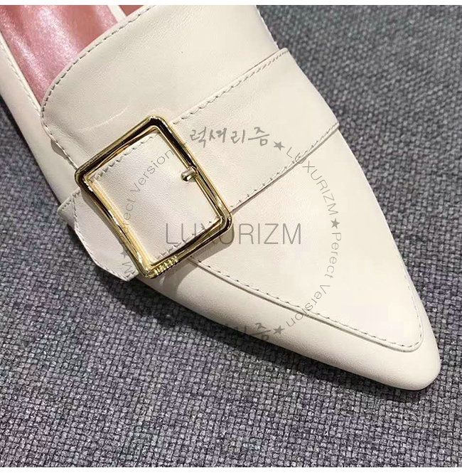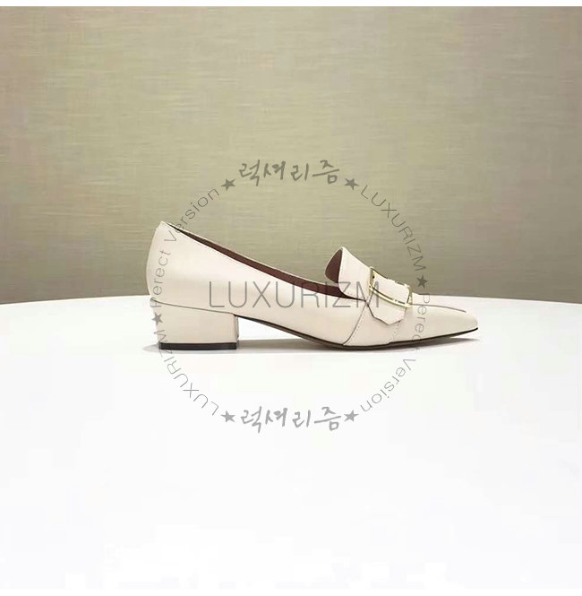 하루미 펌프는 송아지 가죽으로 만들어졌으며 얇고 직사각형의 버클 디테일이 특징입니다.