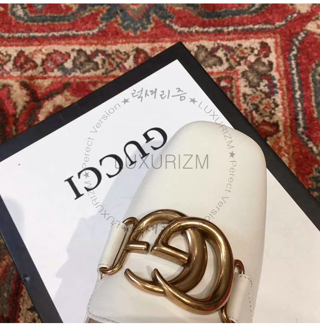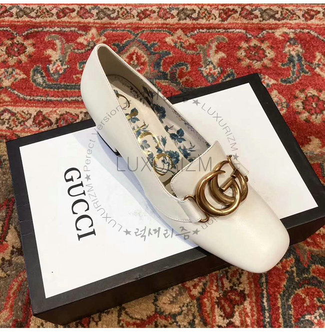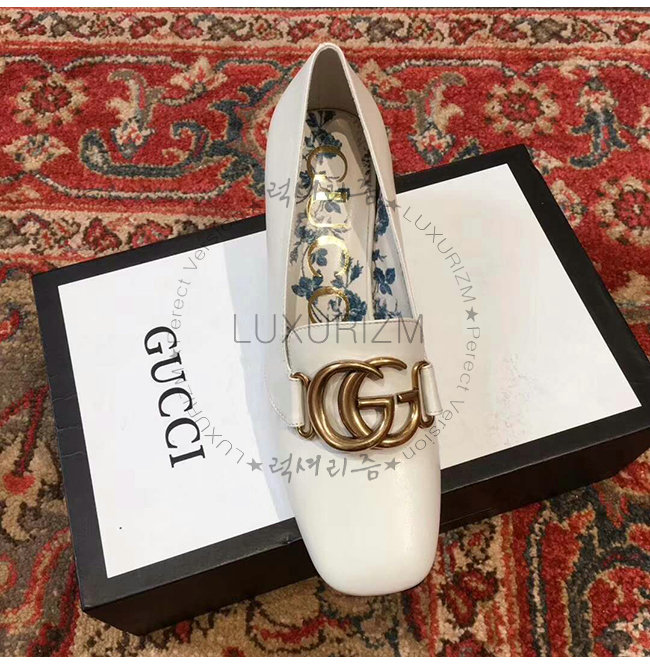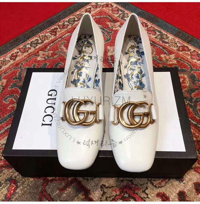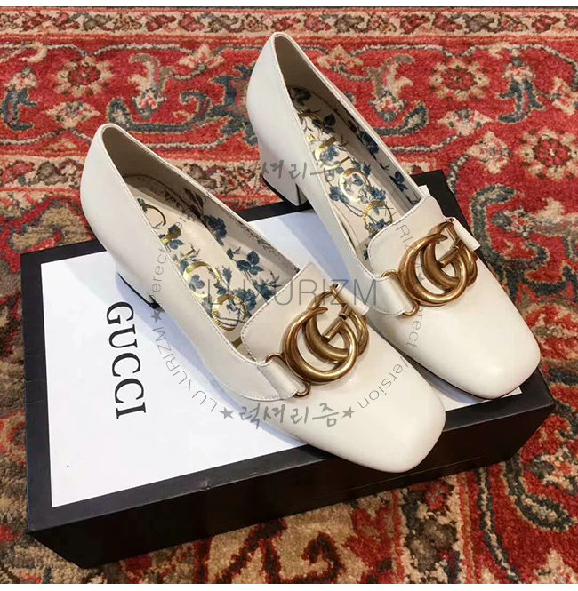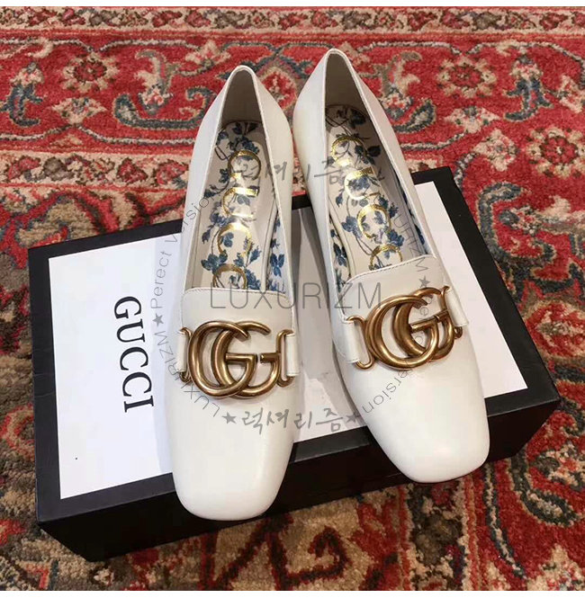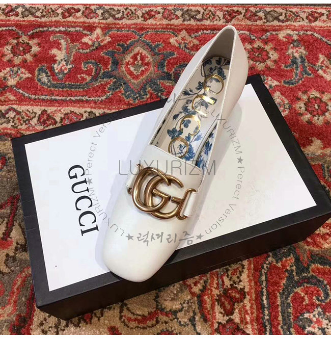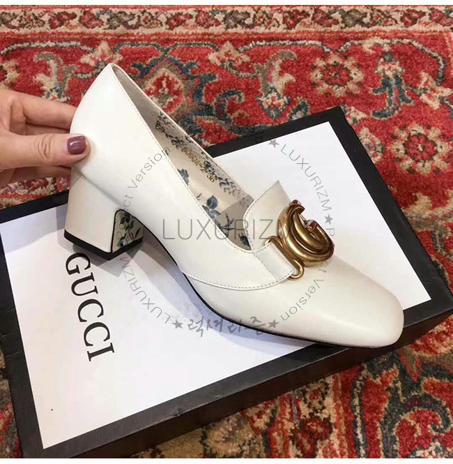 GUCCI-525333 9526 구찌 빅토아르 화이트 가죽 더블 G 장식 미드힐 펌프스