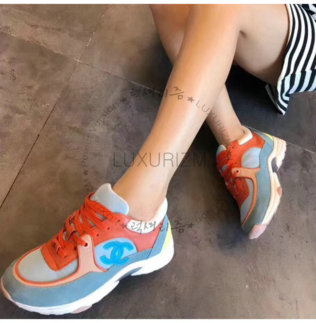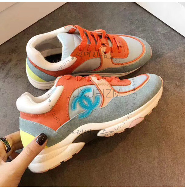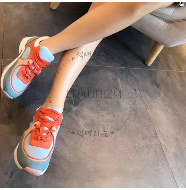 CHANEL-G34360 샤넬 코랄 라이트 블루 스웨이드 카프스킨 스니커즈