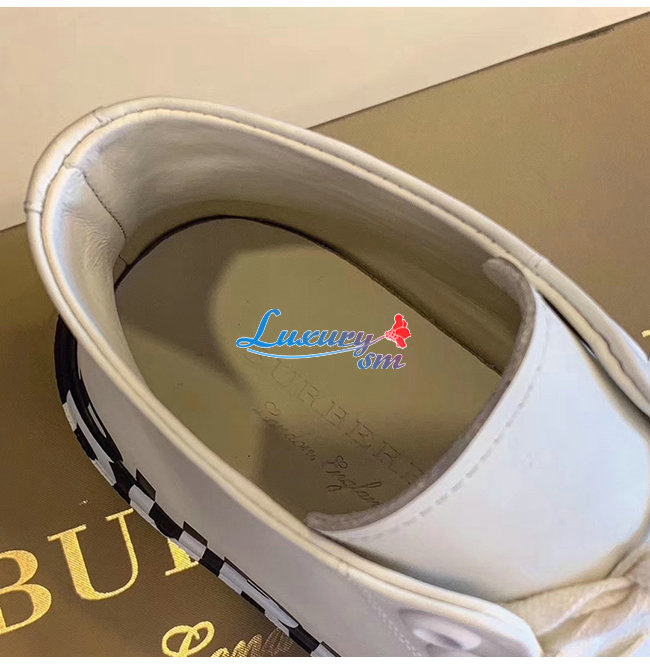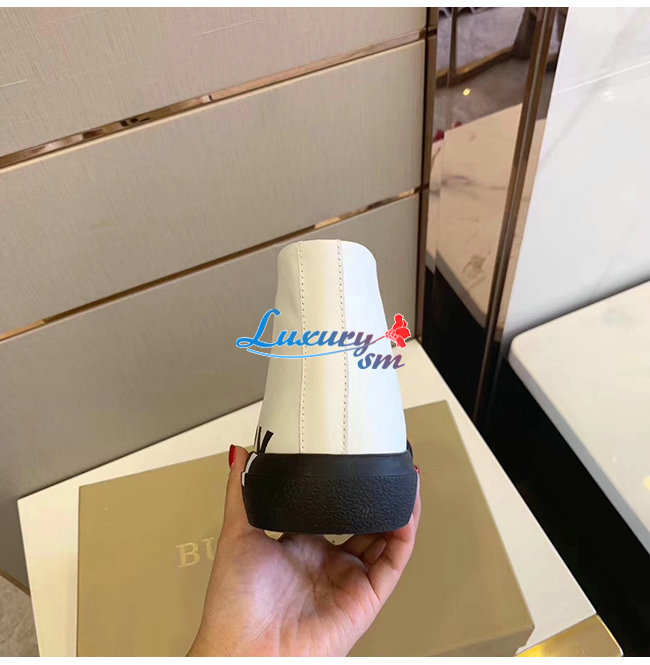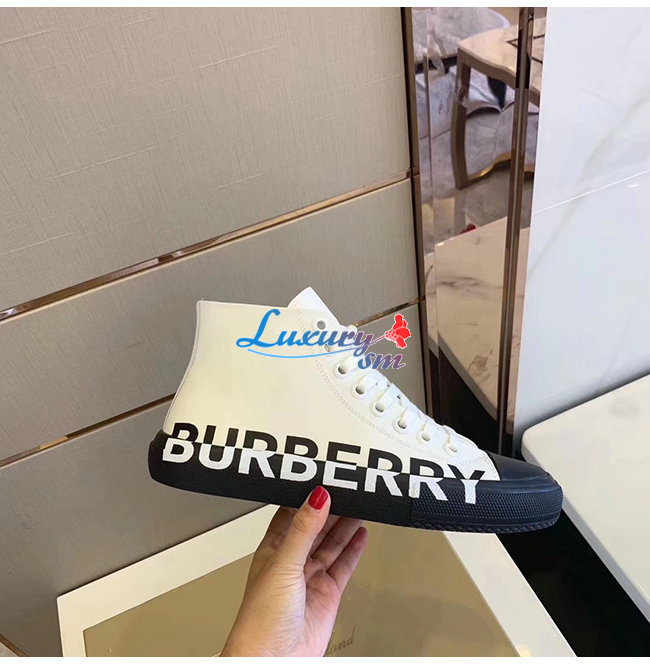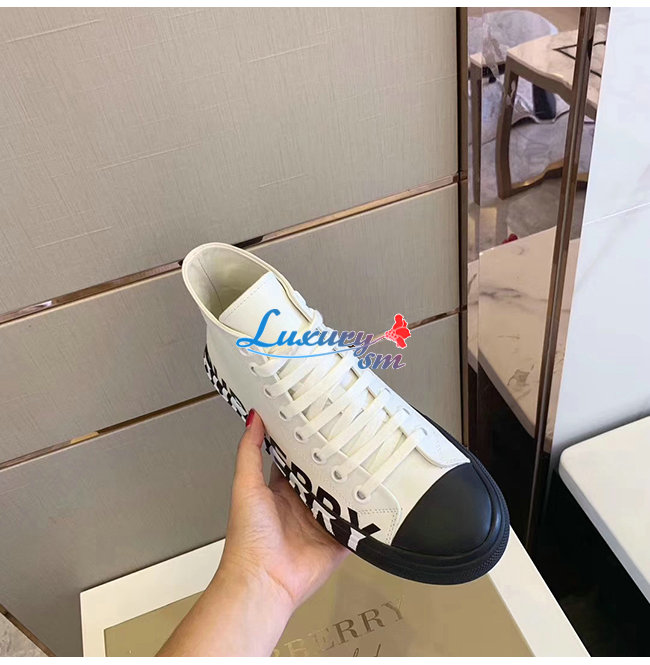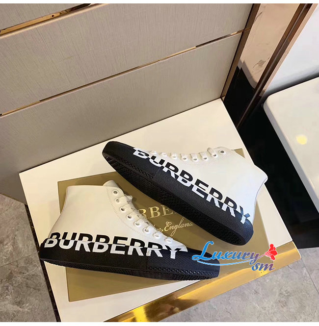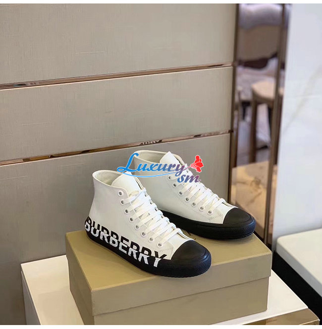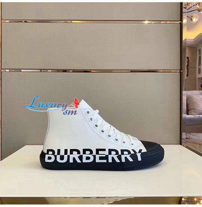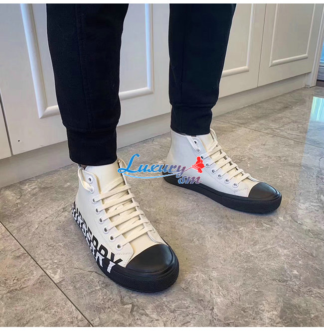 BURBERRY-80163021 버버리 화이트/블랙 로고 프린트 송아지 가죽 개버딘 하이톱 스니커즈