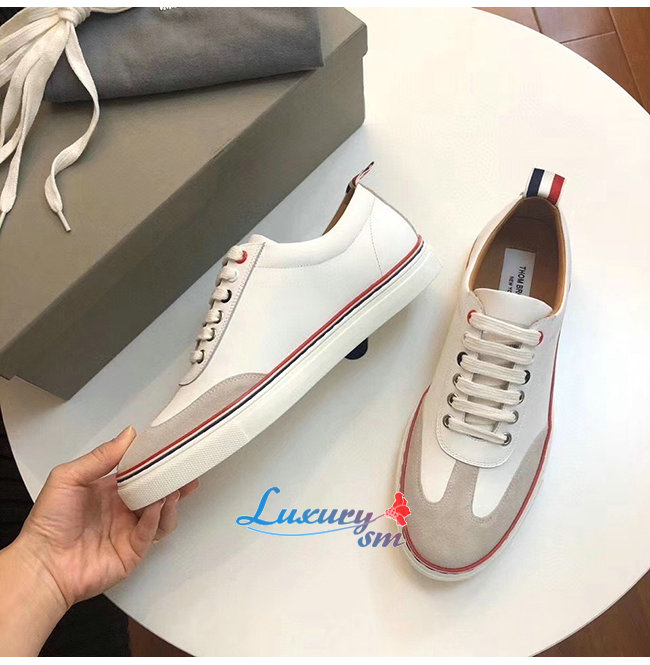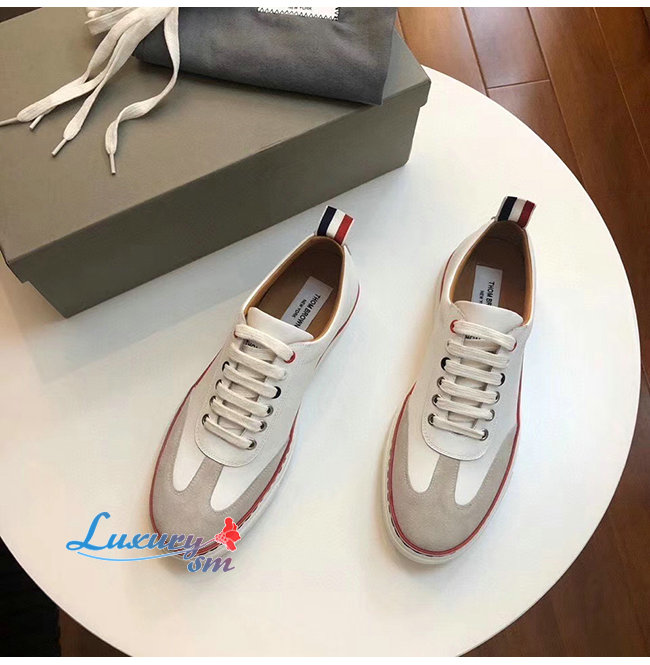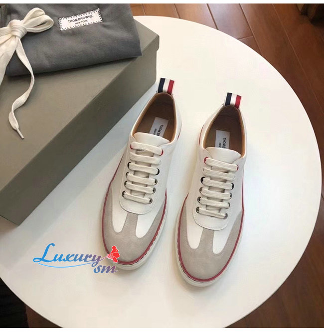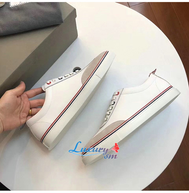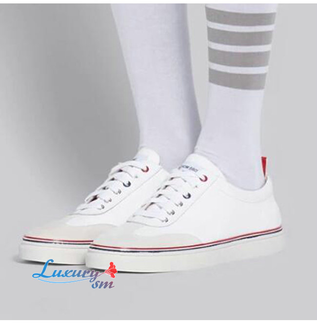 THOM BROWNE-067A001 톰 브라운 화이트 코튼 캔버스 스트레이트 토 캡 트레이너 슈즈 남여공용