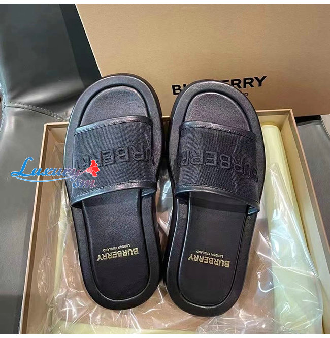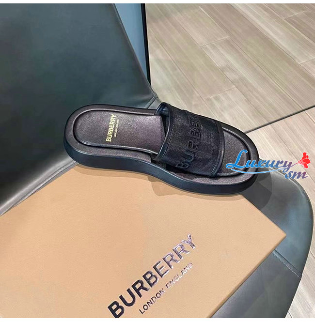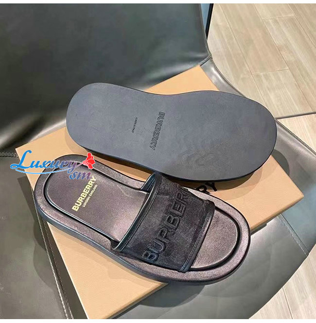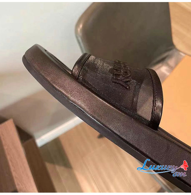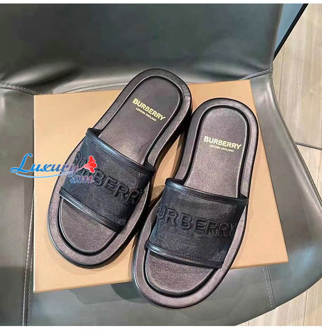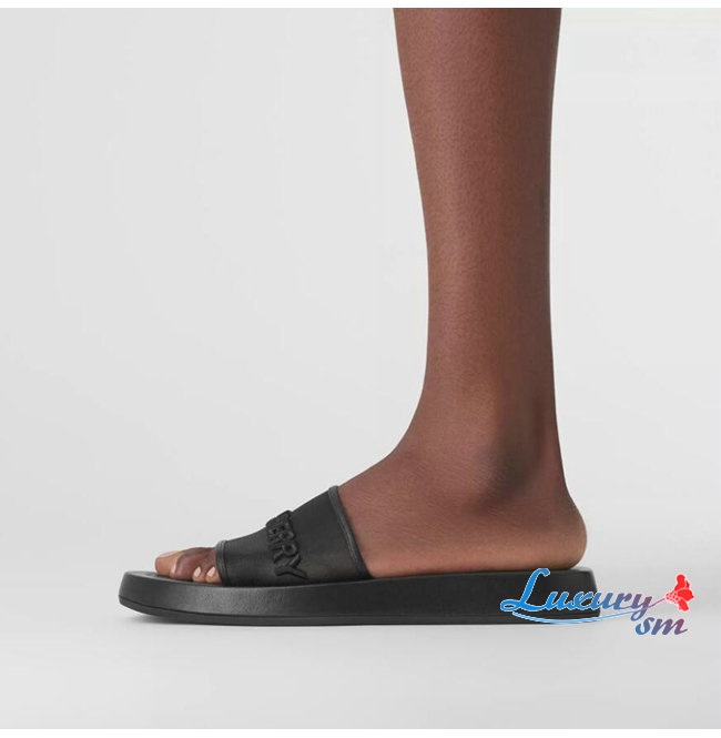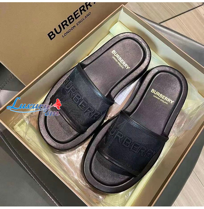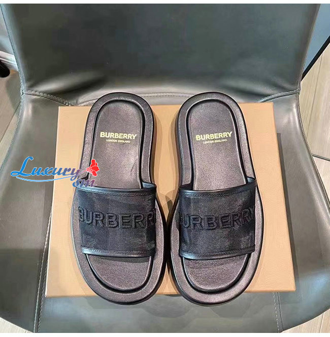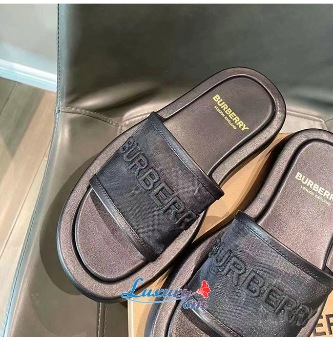 BURBERRY-80392501 버버리 블랙 엠브로이더리 로고 메시 레더 슬라이드
