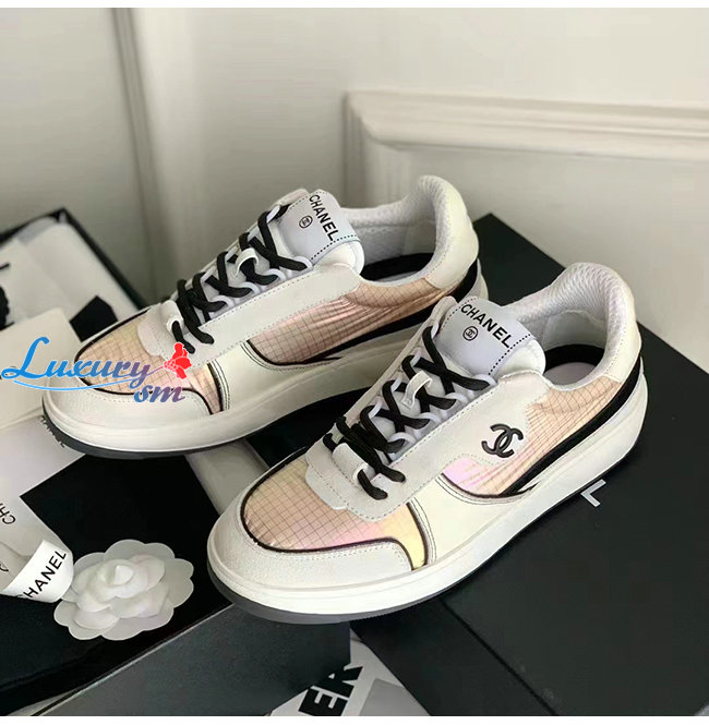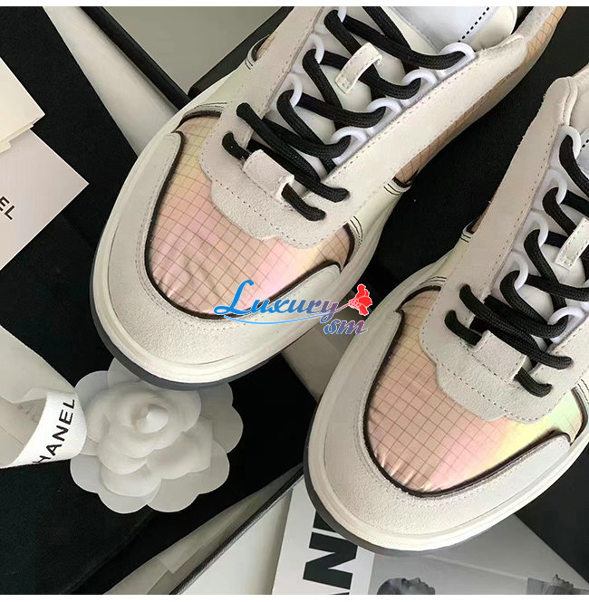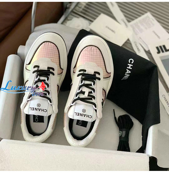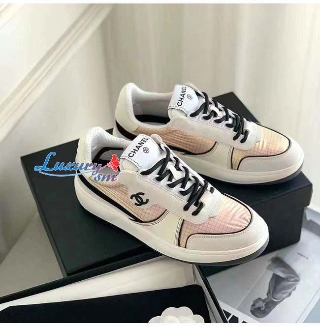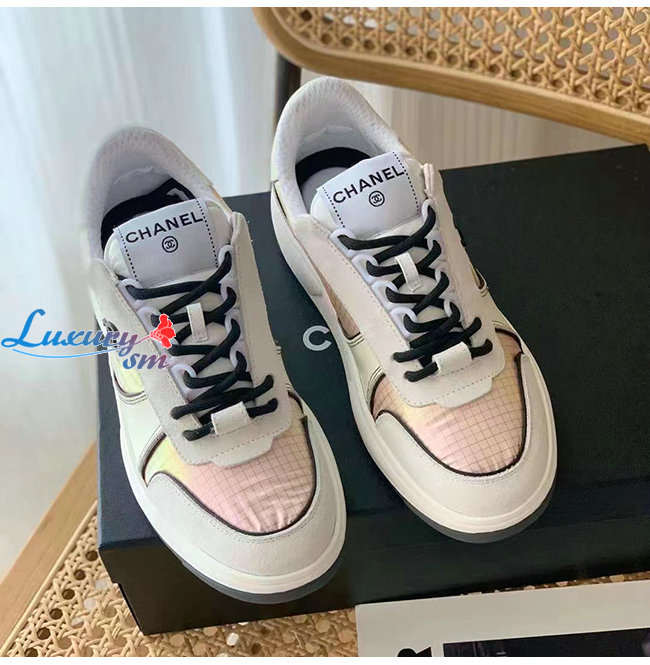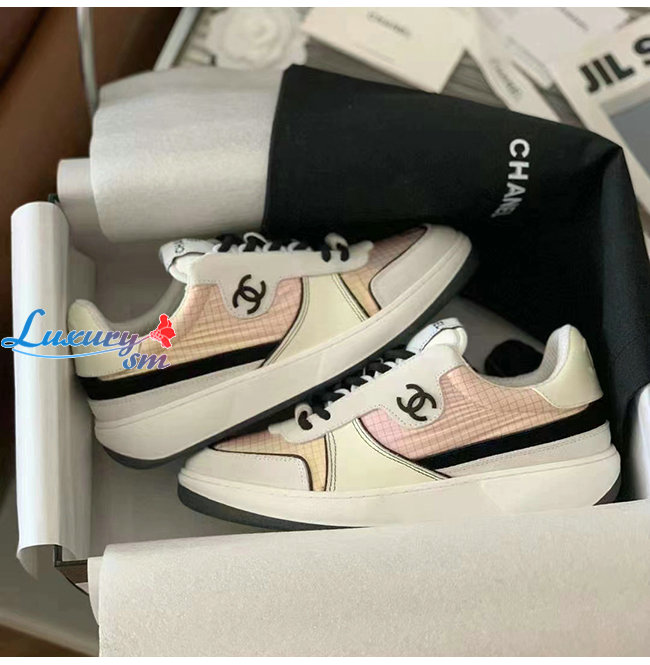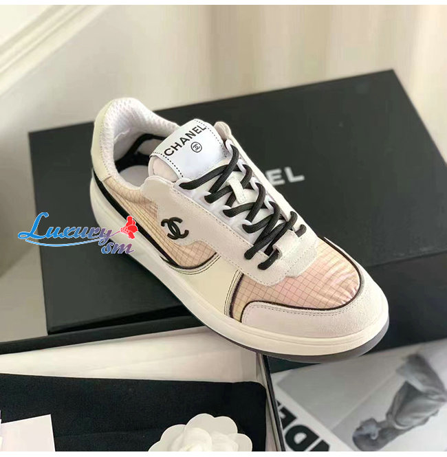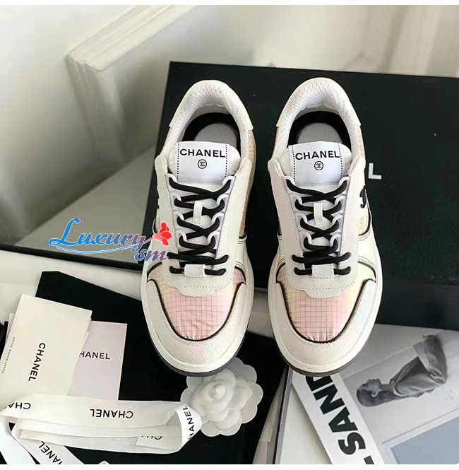 CHANEL-G39802 샤넬 화이트/핑크 패브릭 스웨이드 카프스킨 스니커즈 여성용