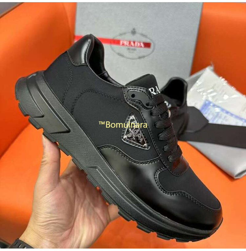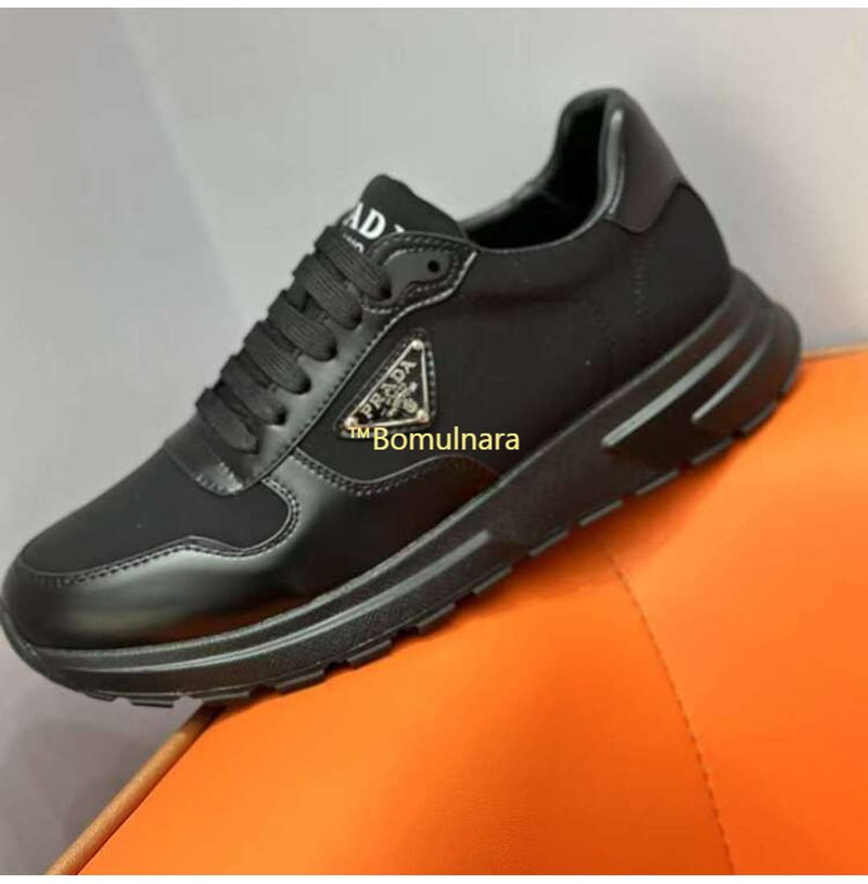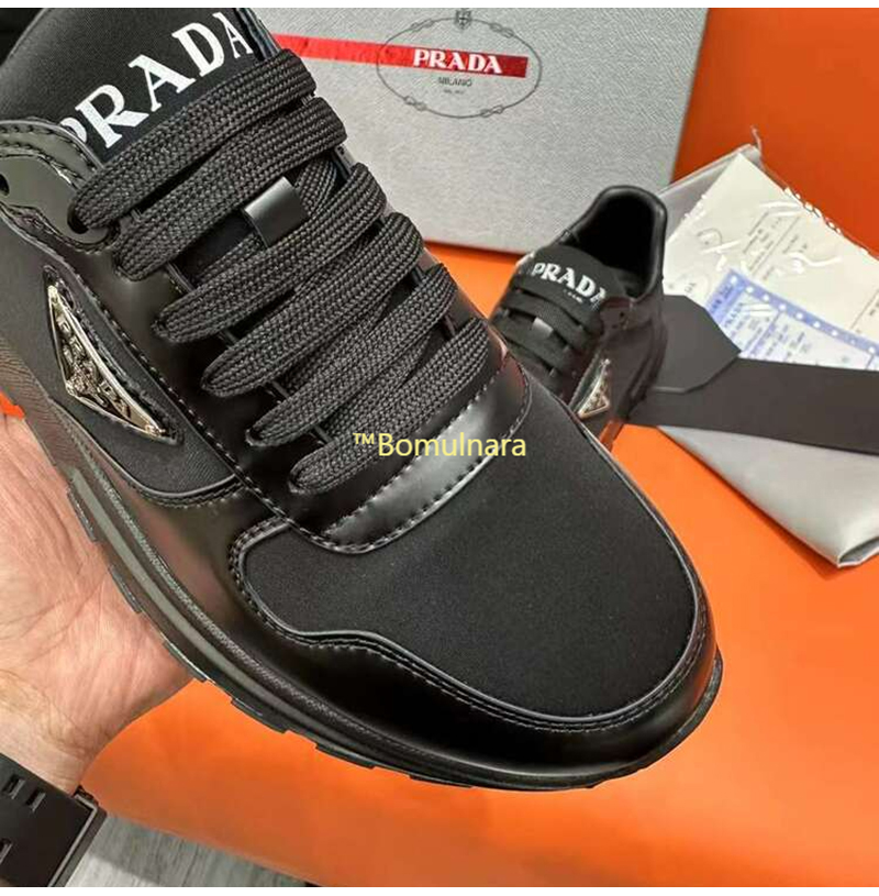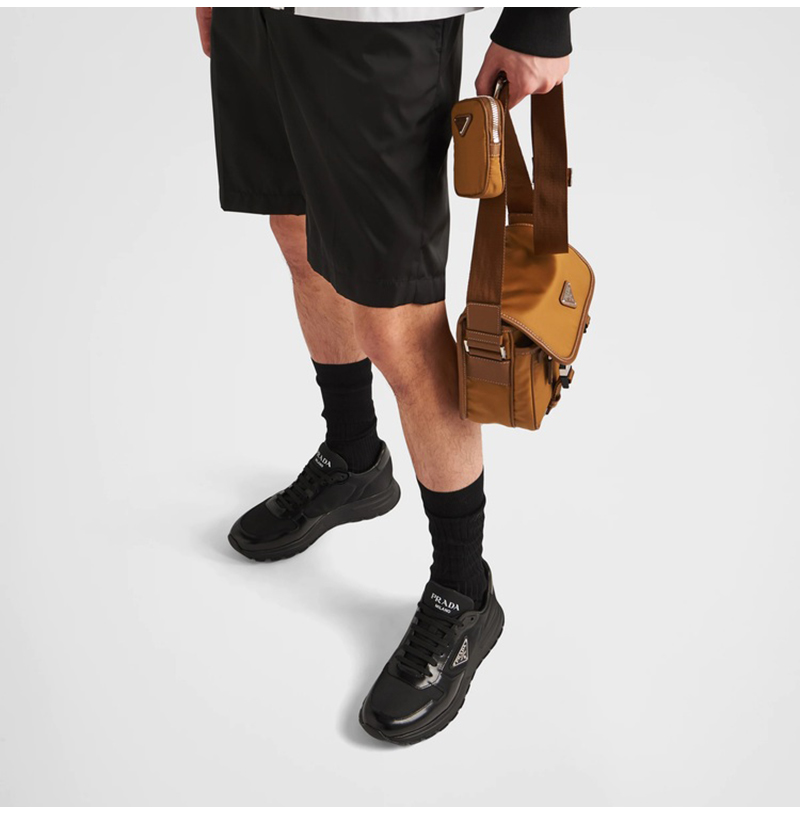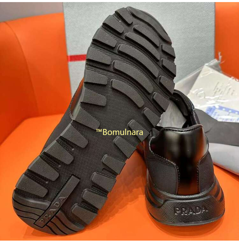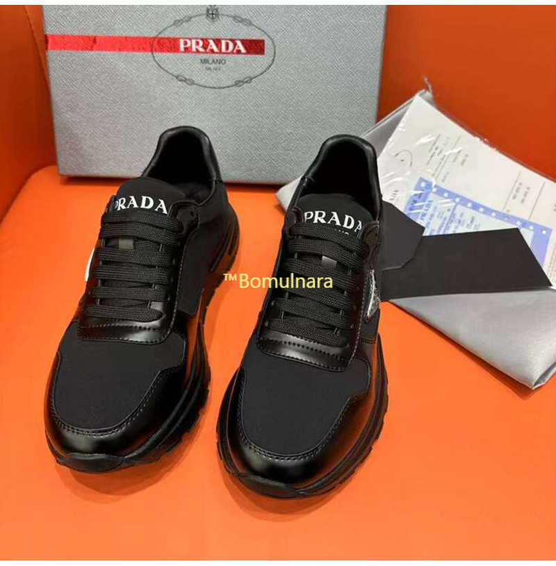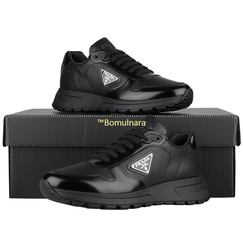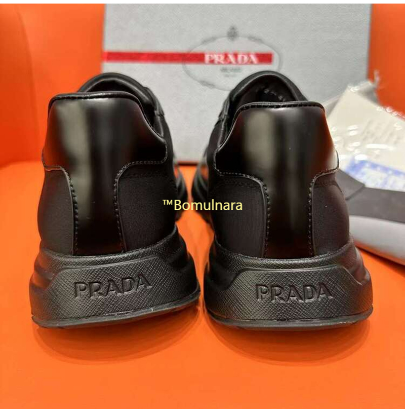 PRADA-2EE369 프라다 블랙 리나일론 및 브러시드 가죽 스니커즈