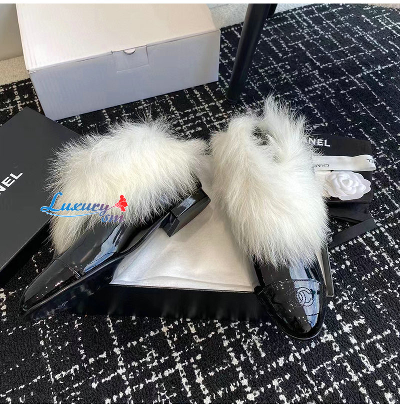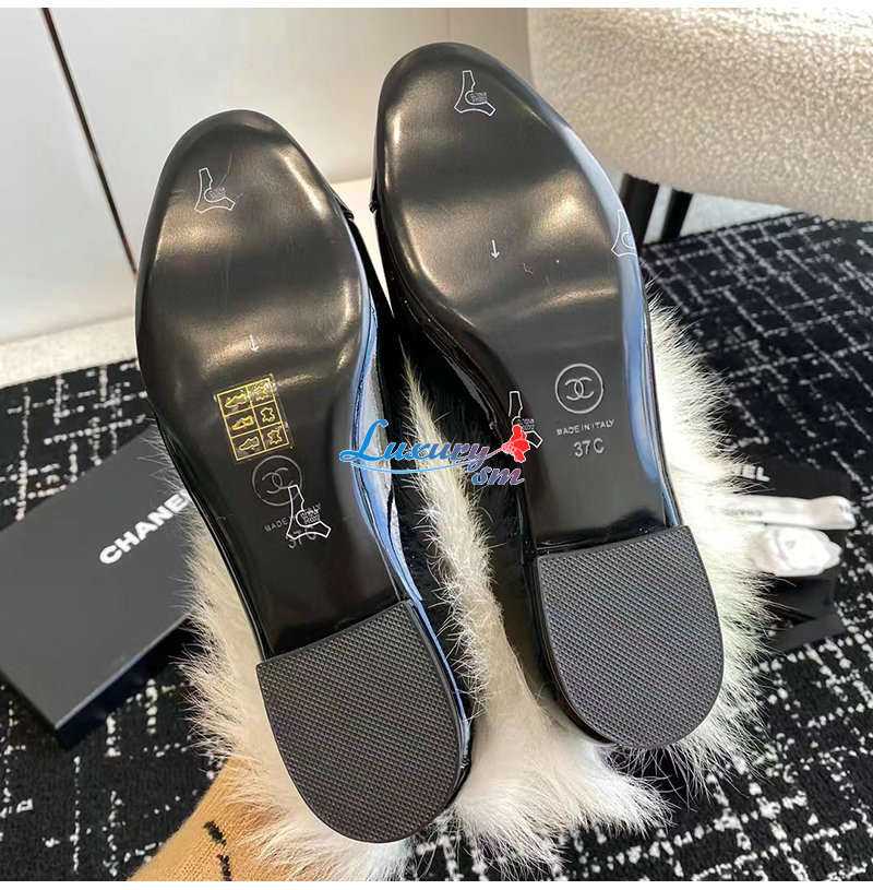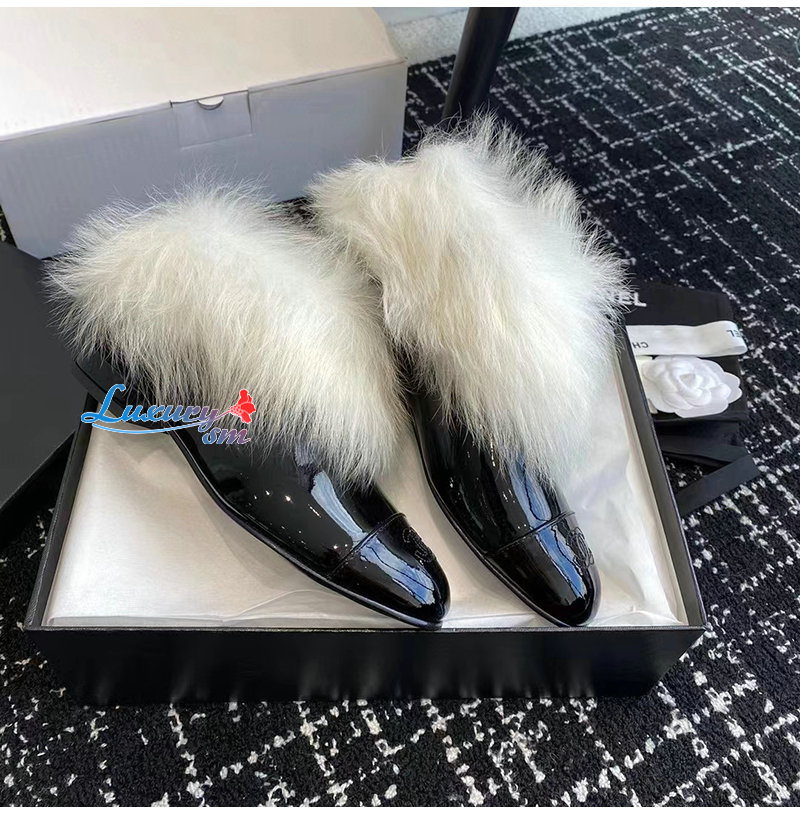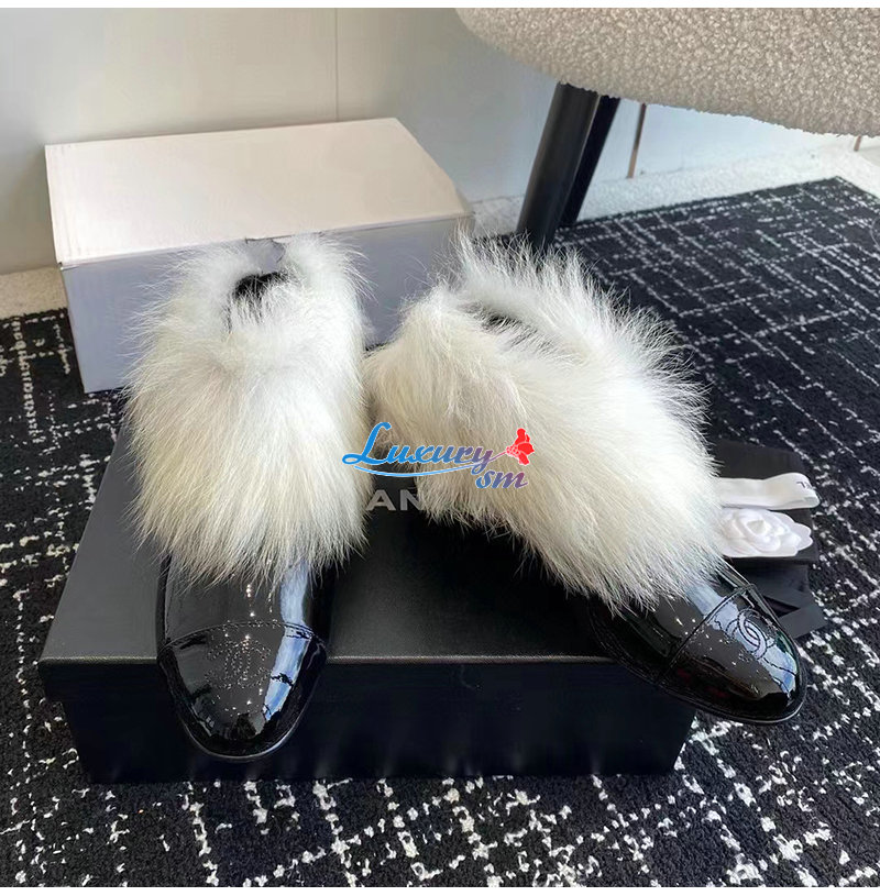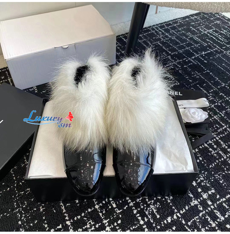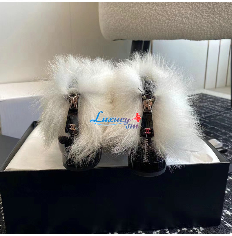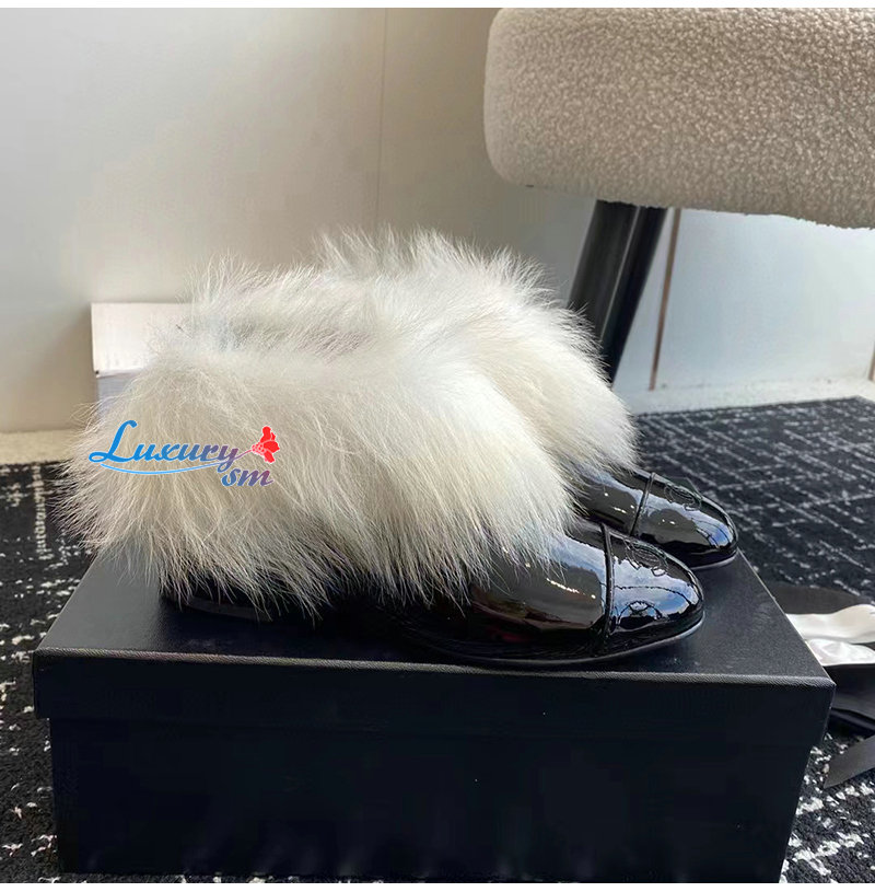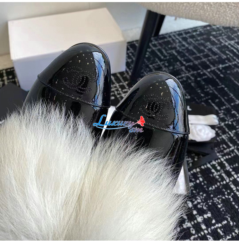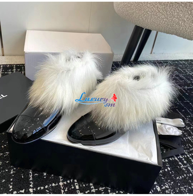 CHANEL-G45177 샤넬 블랙 페이턴트 램스킨 퍼 장식 쇼트 부츠 여성용