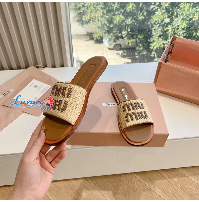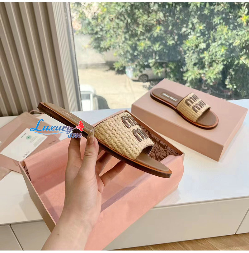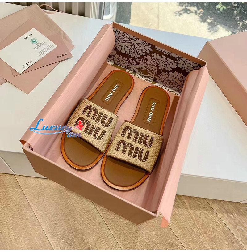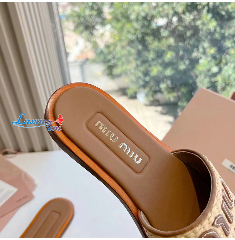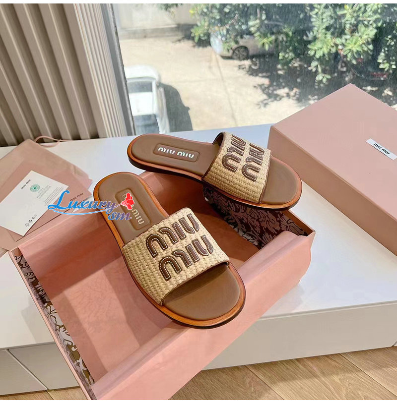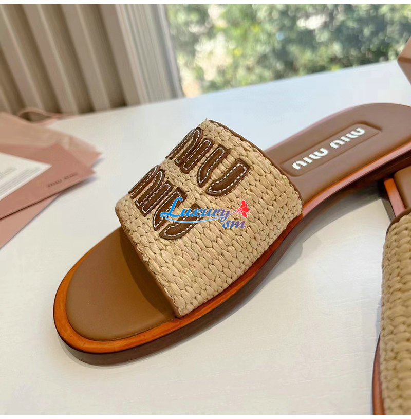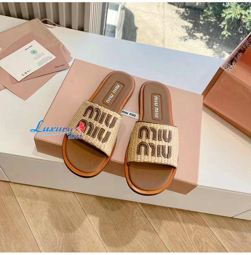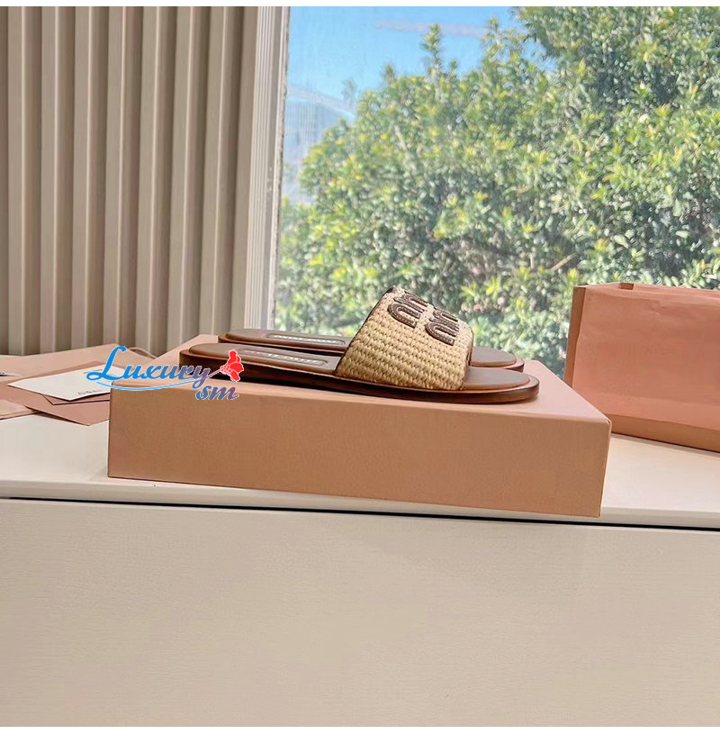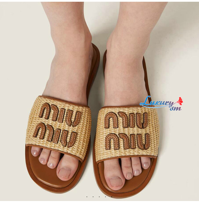 MIUMIU-5XX644 미우미우 내추럴 라피아 우븐 패브릭 슬라이드 여성용