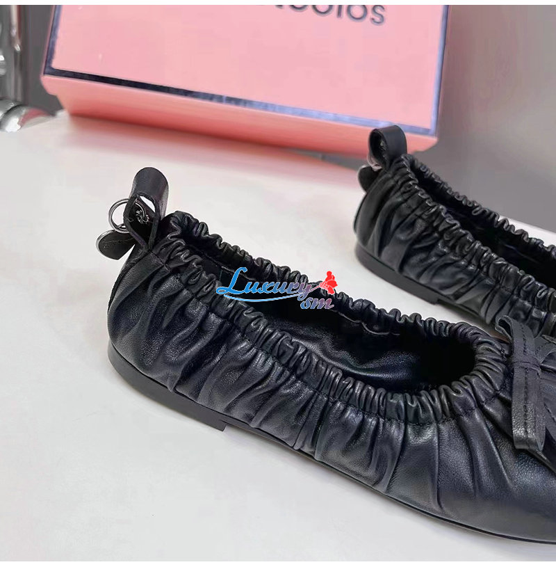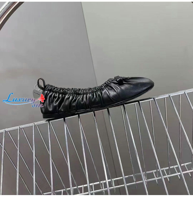 더한 주름 마감 가죽 소재의 플랫 발레 슈즈.