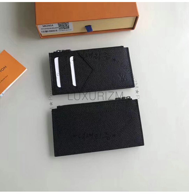 루이 비통 시그니처인 블랙 타이가 가죽으로 소개하는 코인 카드 홀더는 간결하고 얇은