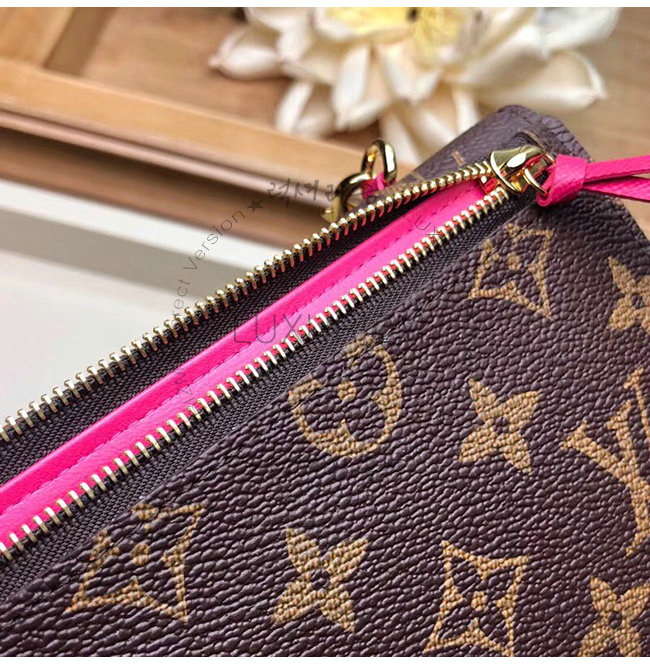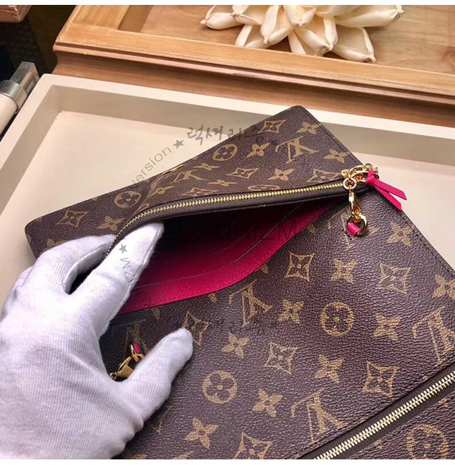 모노그램 캔버스 포쉐트 위크엔드 클러치를 소개합니다. 분리 가능한 체인으로 어깨에 걸칠수있는