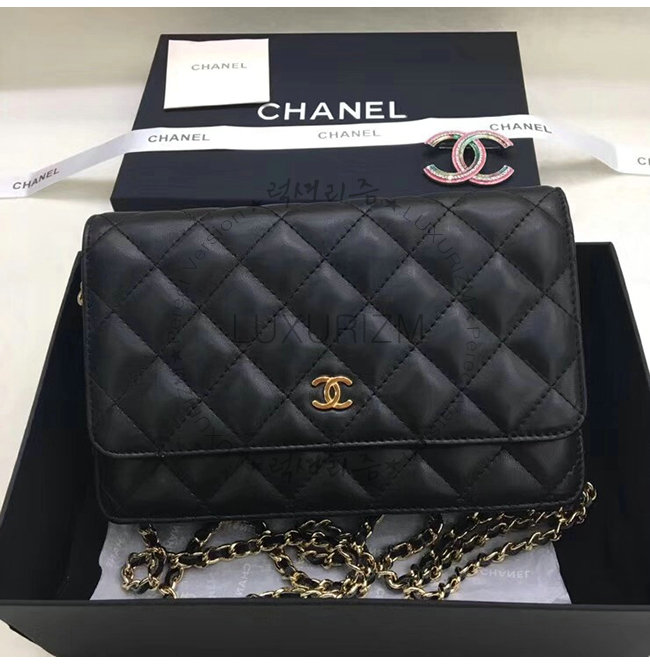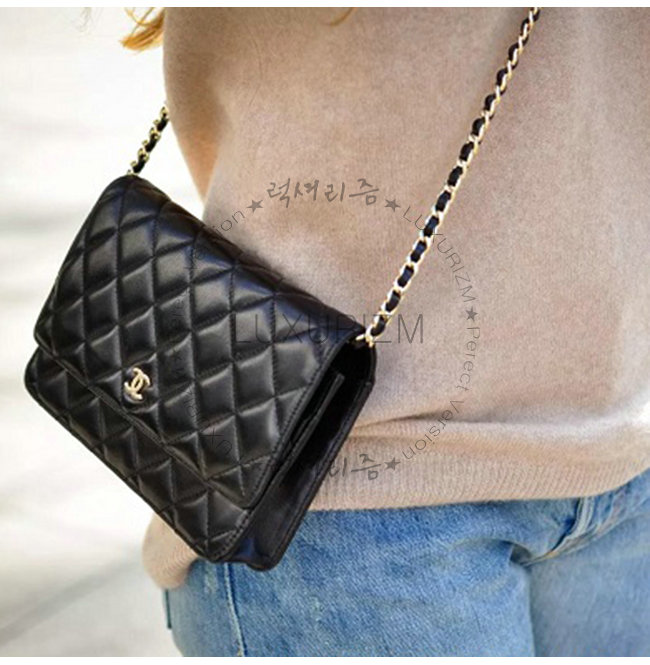 [스페셜오더]CHANEL-A33814 샤넬 그레인드 램스킨 참 장식 골드 메탈 블랙 클래식 체인 지갑 가격 : 400,000원