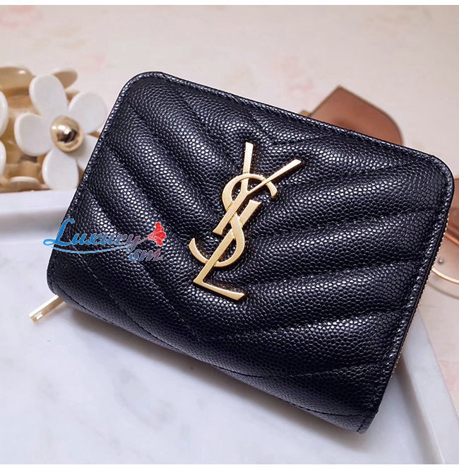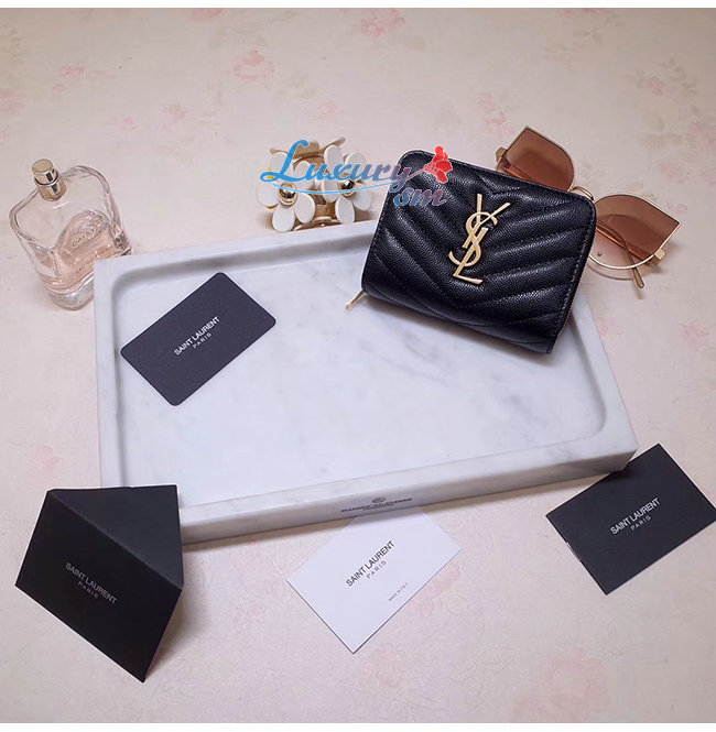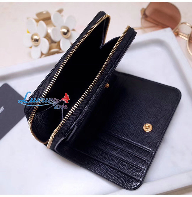스티칭 디테일의 클래식 생 로랑 컴팩트 지갑.