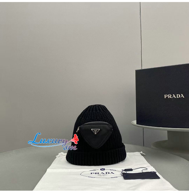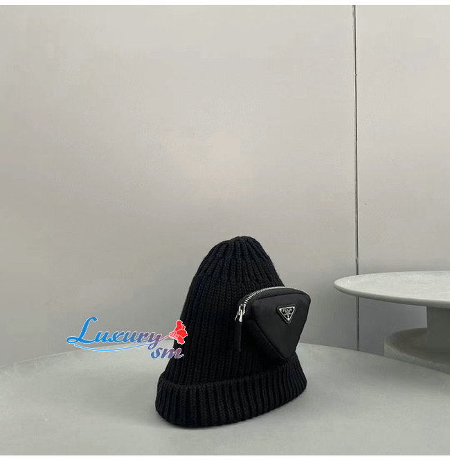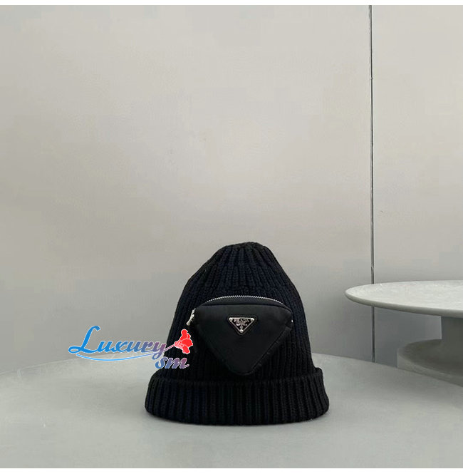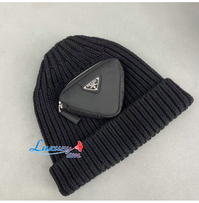 PRADA-10201 프라다 블랙 니트 코튼 트라이앵글 로고 포켓 장식 비니 여성용
